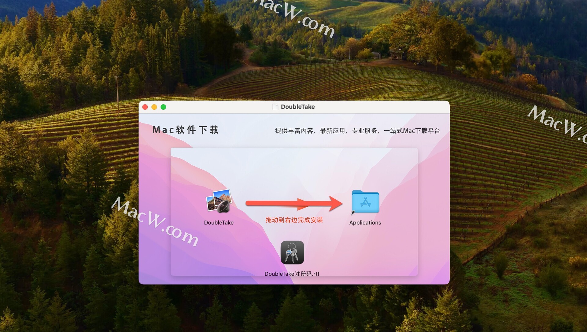 软件安装包下载完成后,拖动左侧的DoubleTake软件到右侧的应用程序中进行安装。
