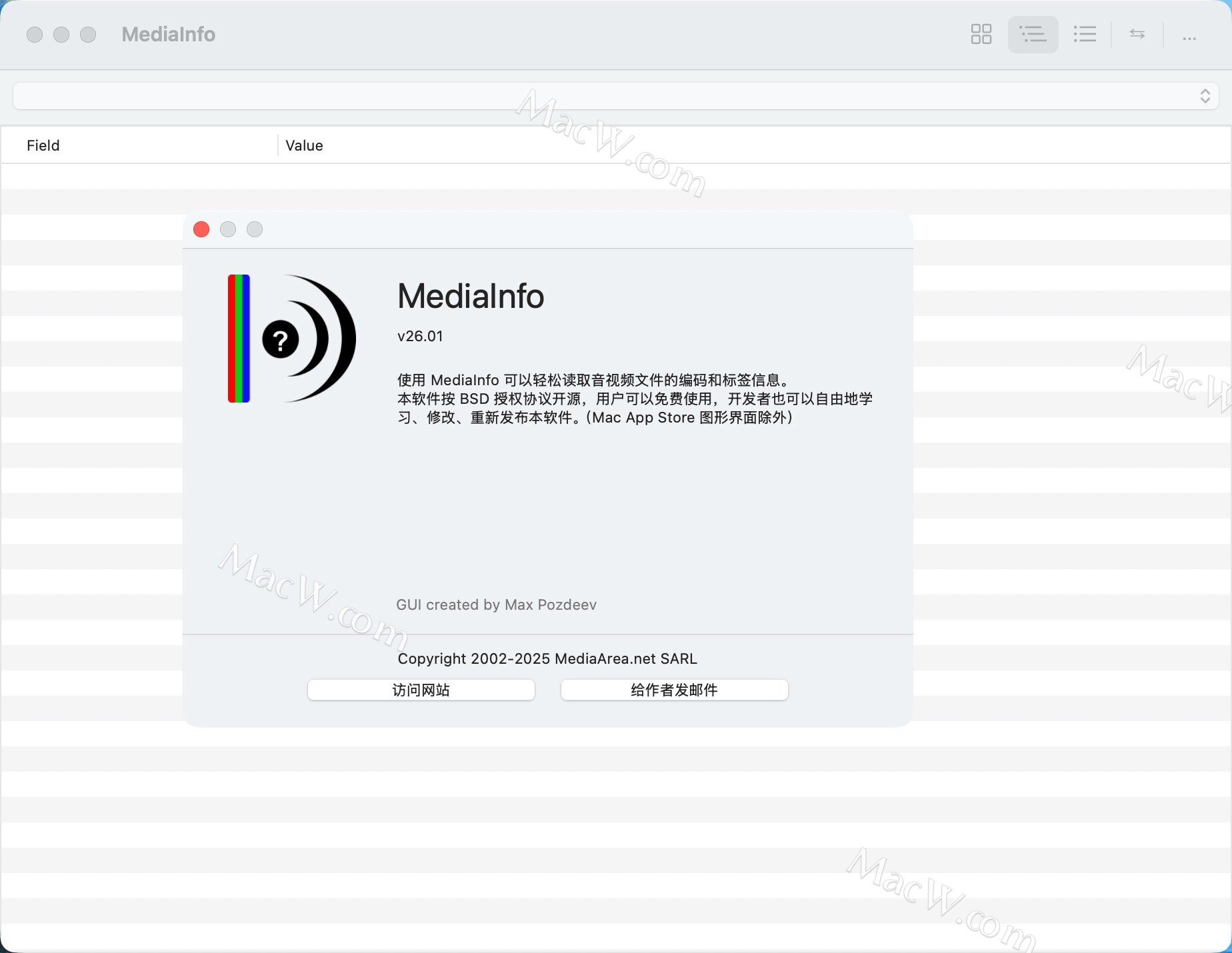 MediAInfo是应用在Mac上的一款音视频编码检测工具,用来分析视频和音频文件编码和内容信息的工具。支持众多视频和音频文件格式,以及多种查看方式文本,表格,树形图,网页……信息可导出为文本,CSV,HTML等文件,多国语言,支持简体中文。