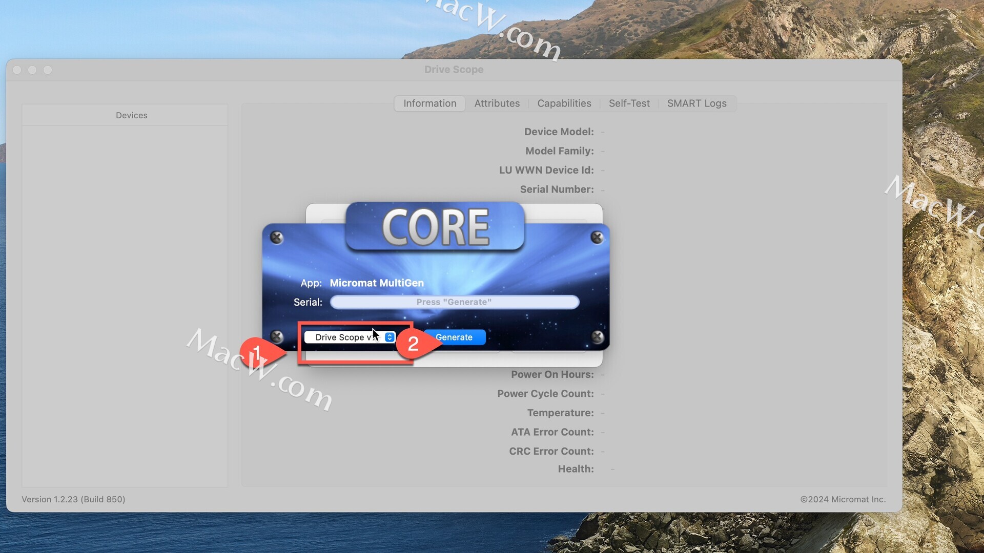 在下拉选项中选择Drive Scope v1,点击Generate生成注册码,双击注册码复制