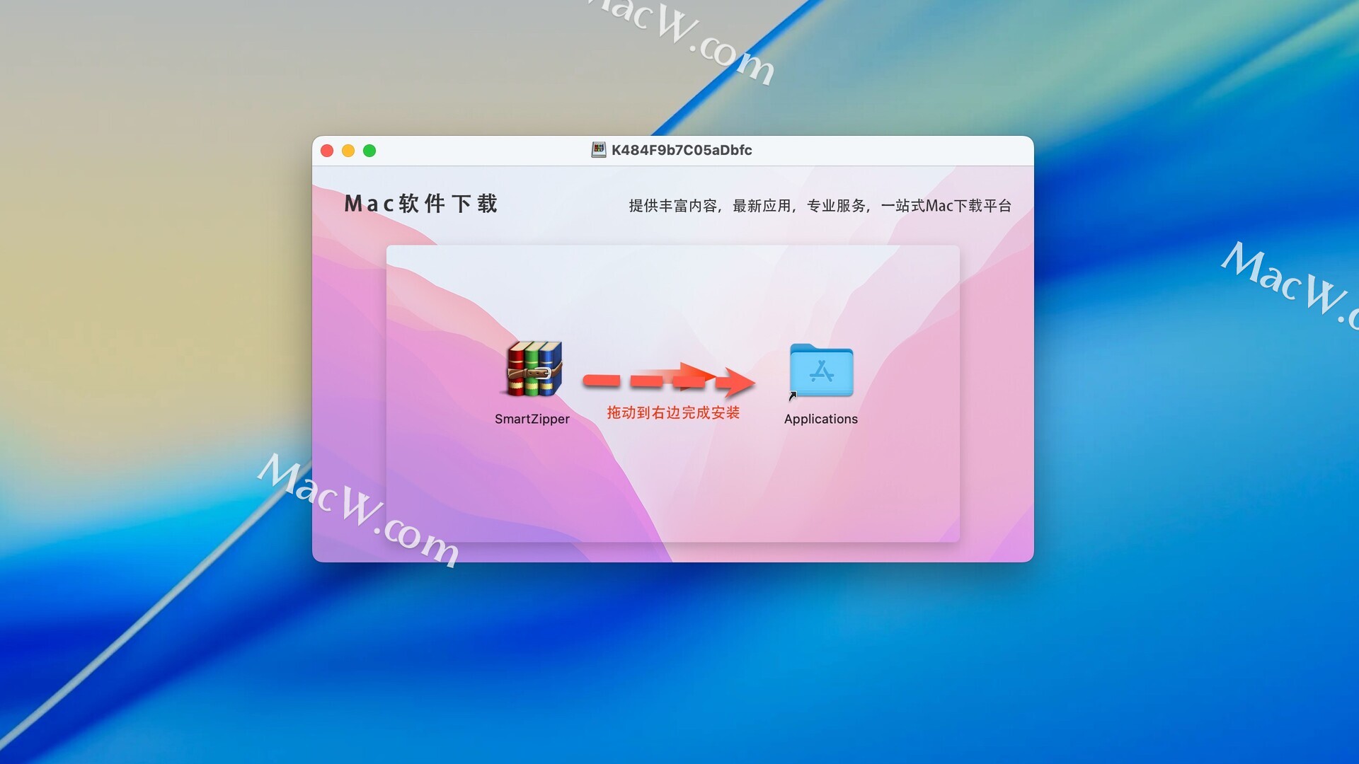 安装包下载完成后打开,拖动左侧的SmartZipper 到右侧应用程序中即可