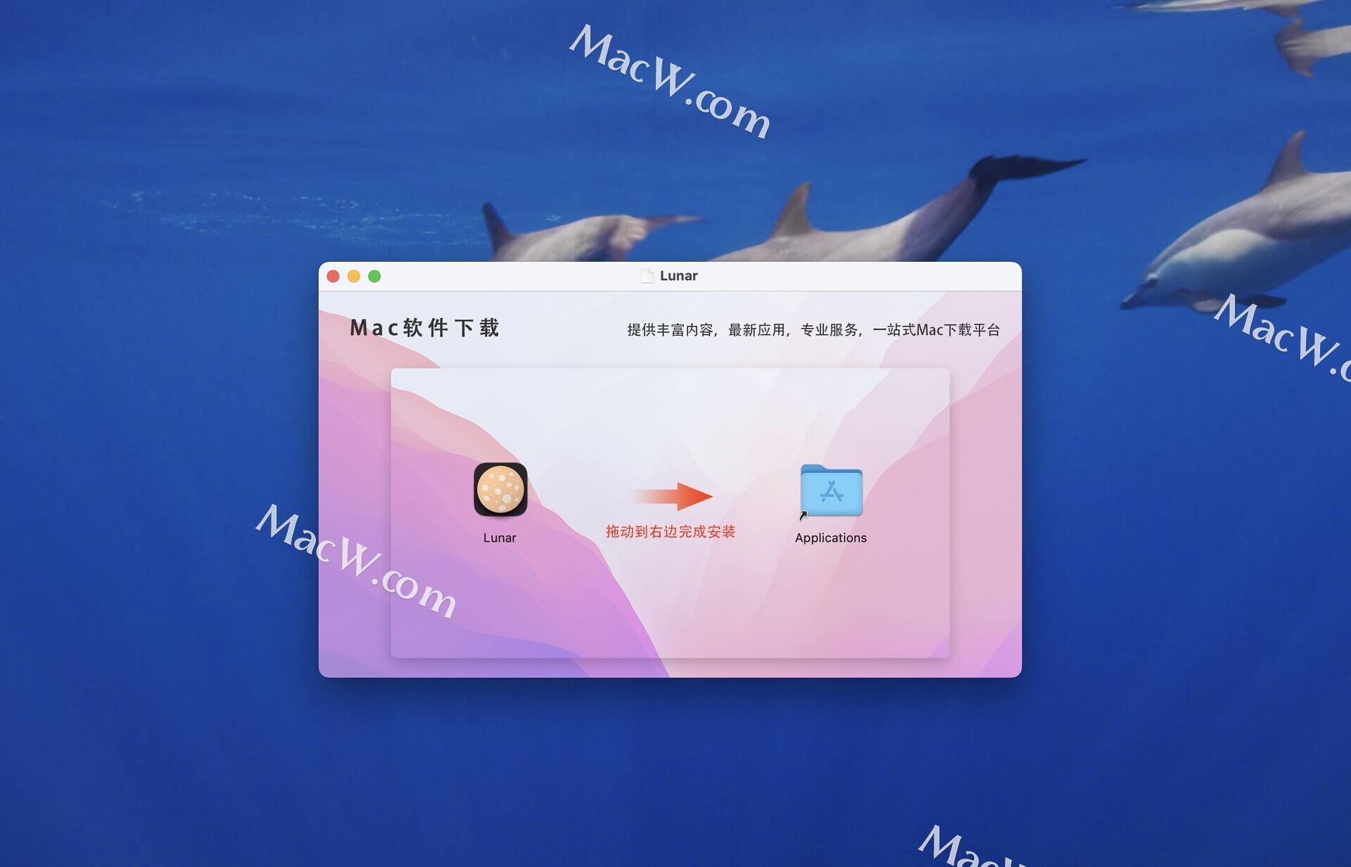 安装包下载完成后,拖动左侧的Lunar到右侧应用程序中即可