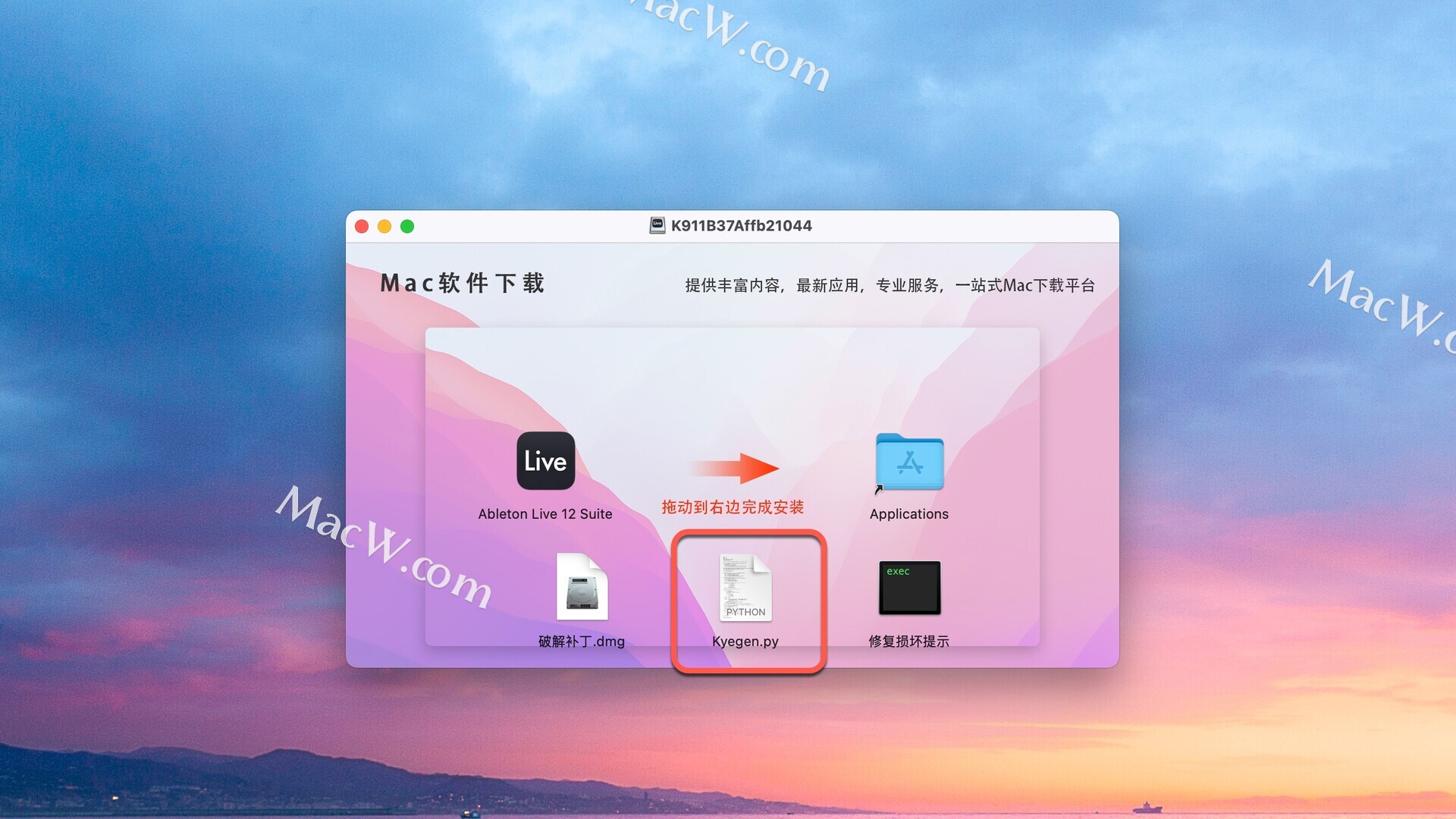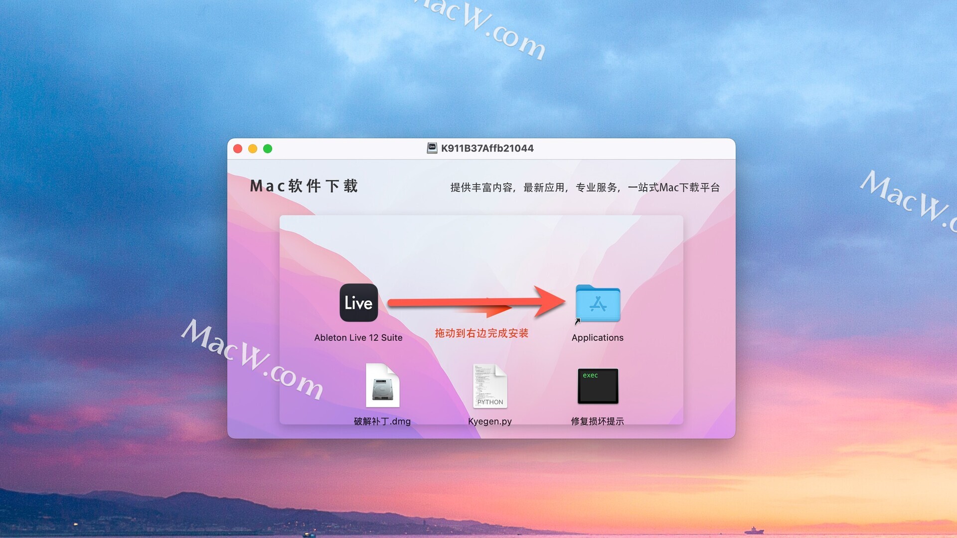 Ableton Live 12破解版下载完成后打开,将左侧Ableton Live 12 Suite拖入右侧应用程序中进行安装