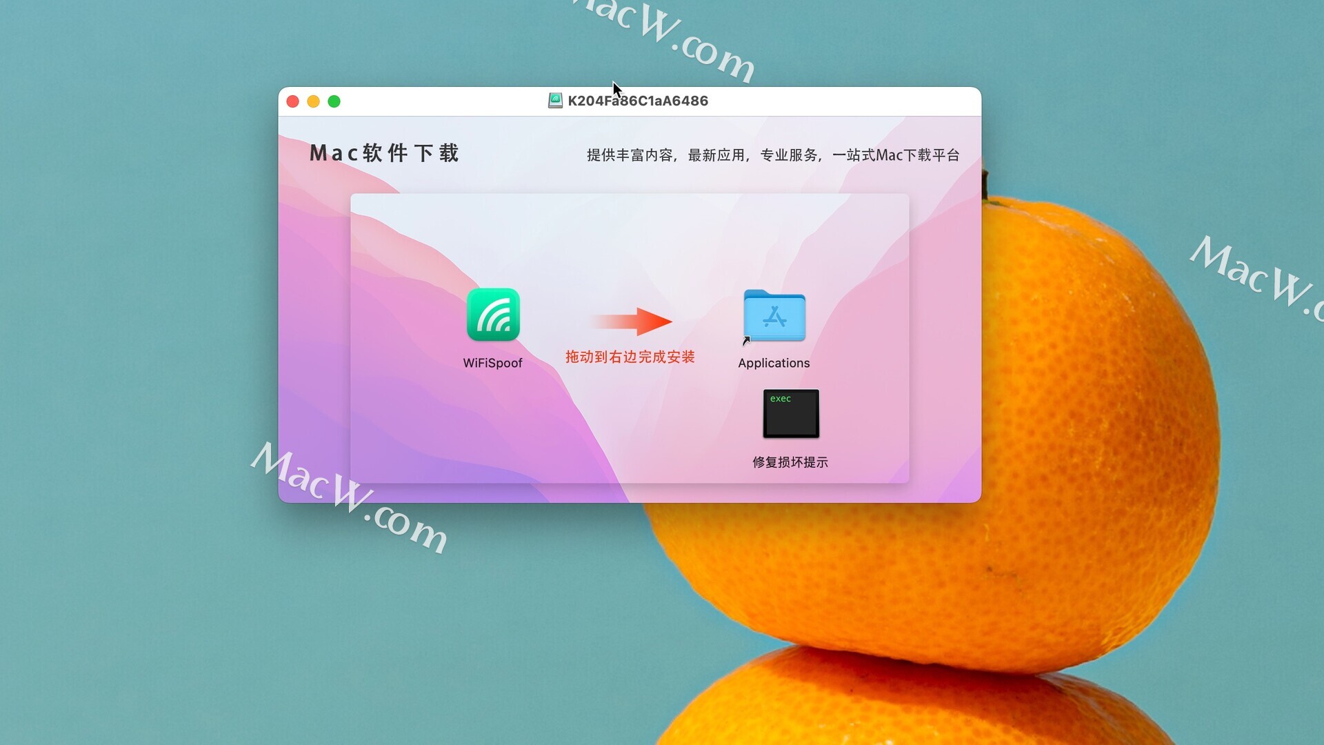 安装包下载完成后,拖动左侧的WiFiSpoof到右侧应用程序中即可