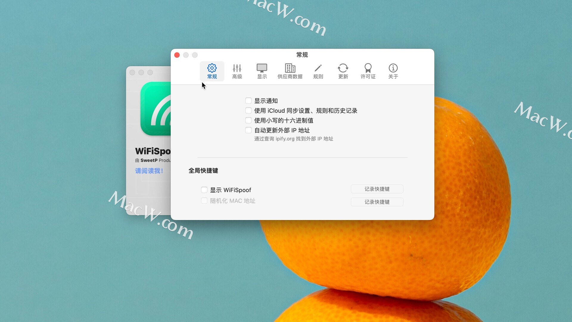 个性化随机MAC地址并设置您自己的热键在WiFiSpoof Preferences窗口中,您可以选择是否要在随机地址中包含小写HEX值。同时,您可以选择在启动时随机化地址,或添加身份验证密码。更重要的是,WiFiSpoof提供对全局热键的支持:一旦启用,您将能够看到WiFiSpoof窗口,随机化MAC地址,或更新MAC地址,而无需与WiFiSpoof菜单