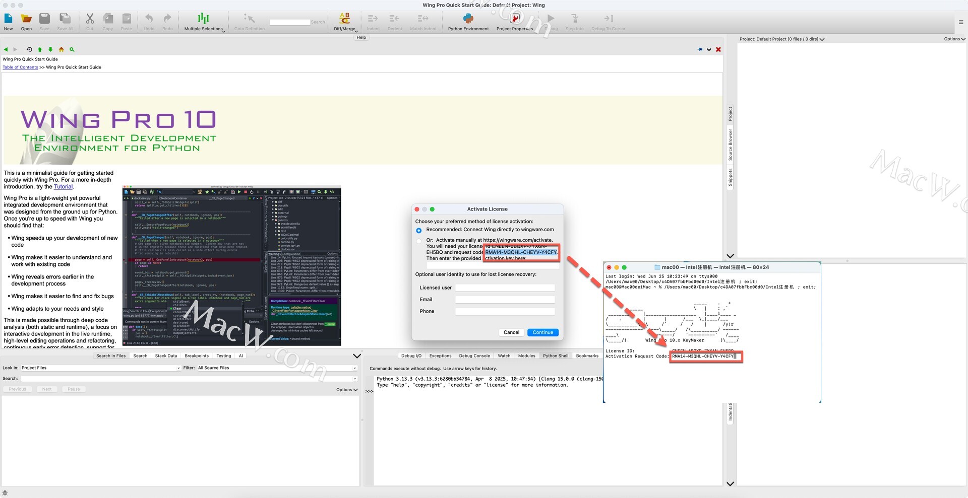 终端会生成另一串WingIDE注册密钥,把WingIDE密钥复制到软件注册页面的正确位置中,再点击Continue