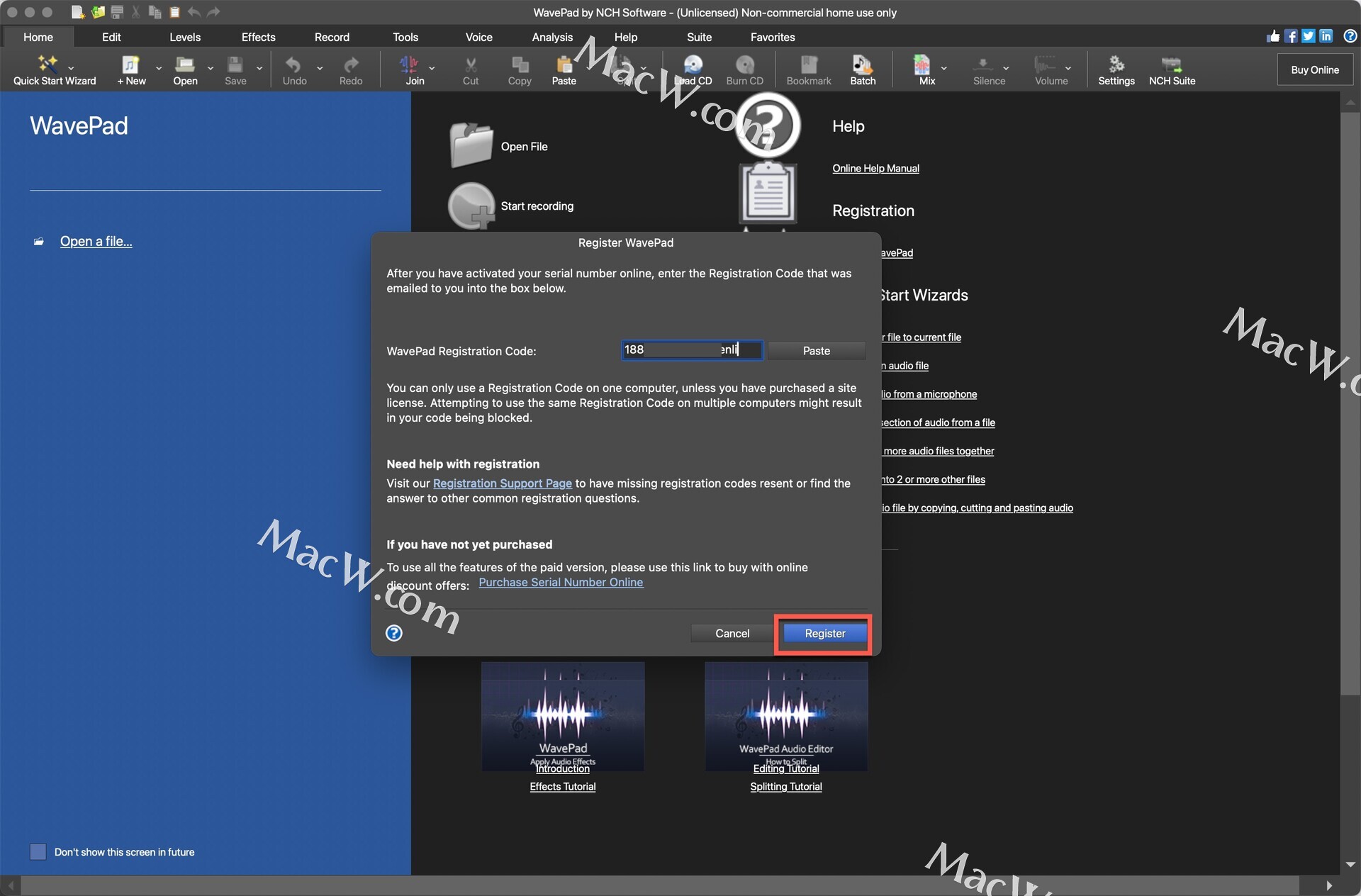 将NCH WavePad Mater注册码复制到对应位置,(点击paste即可粘贴注册码)然后点击registear