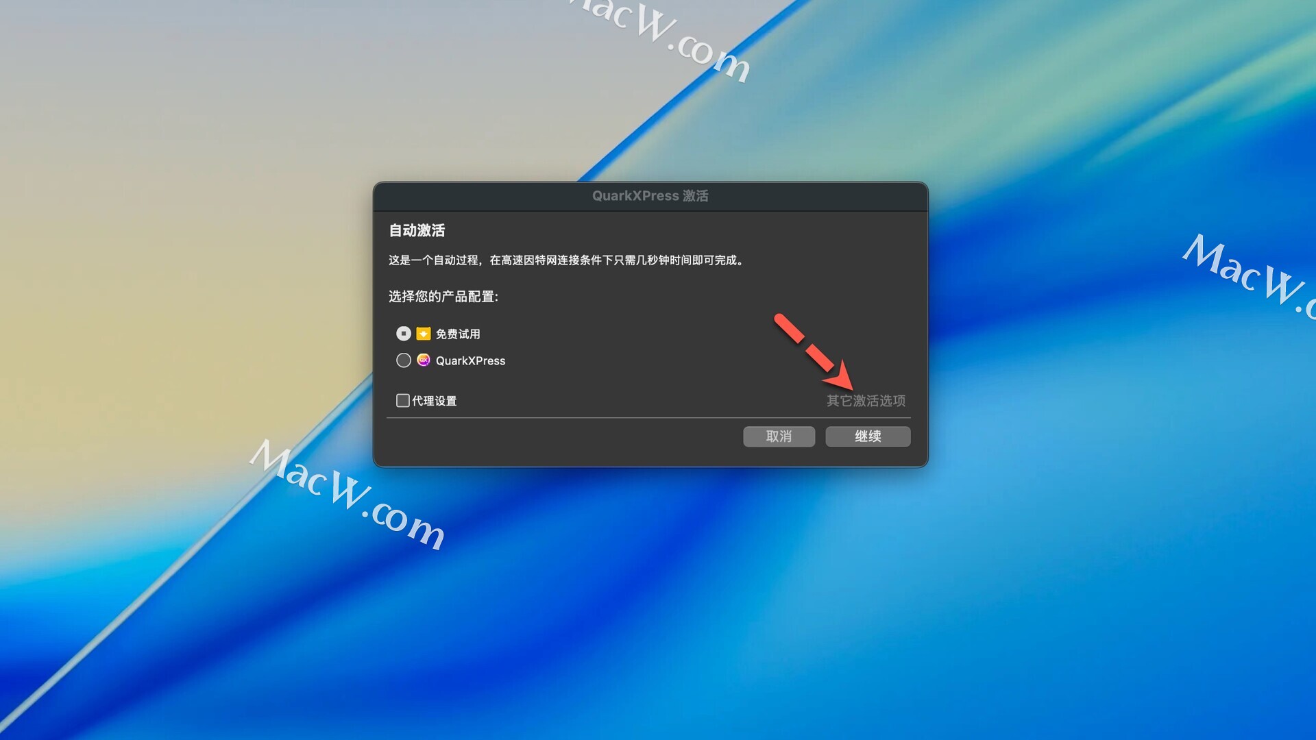 打开QuarkXPress 2024软件,弹出激活页面,点击其他激活选项(备注:断网才有这个选项)