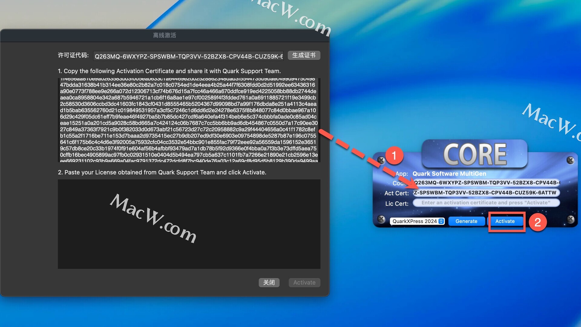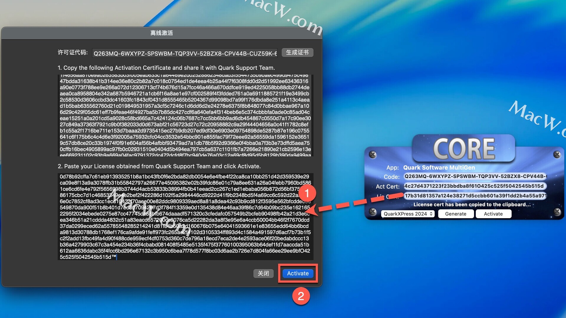 将生成的许可证书复制到Act Cert,点击Activate,如图