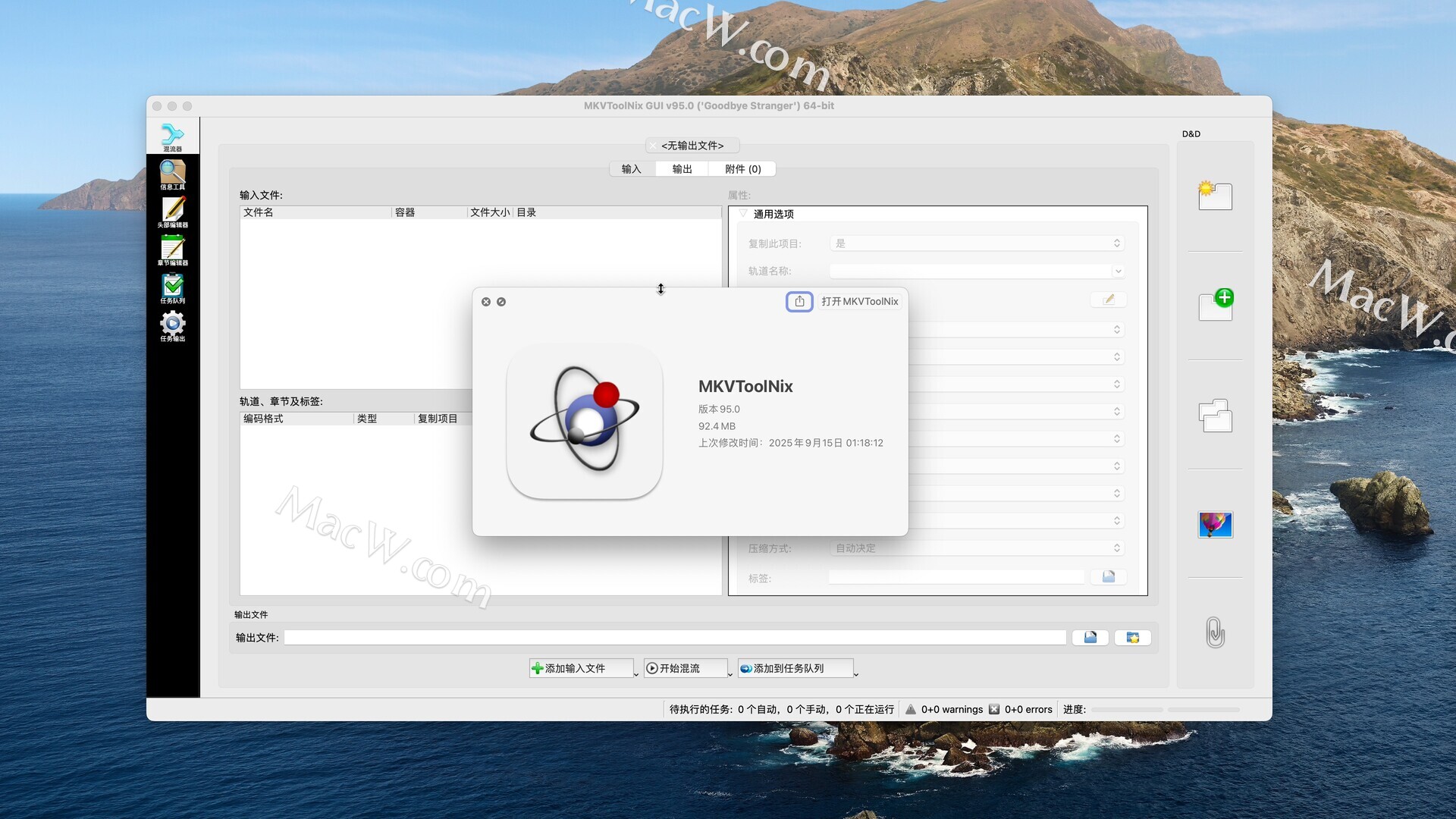 MKVToolNix mac版是Macos上一款mkv视频编辑工具,支持将多种视频、音频、字幕等格式封装成mkv格式,MKVtoolnix mac版一款专业的MKV无损处理编辑工具,可以轻松实现MKV视频封装的功能。本软件测试环境14.1系统!