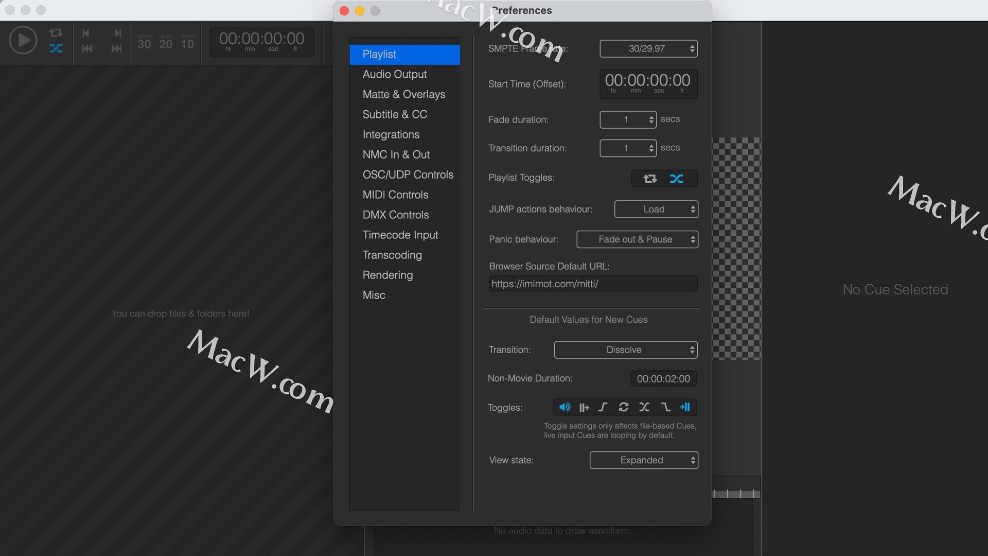 在Mitti的播放列表首选项中,您可以定义淡入/淡出和转换的默认时间,以及默认的SMPTE格式和SMPTE偏移。