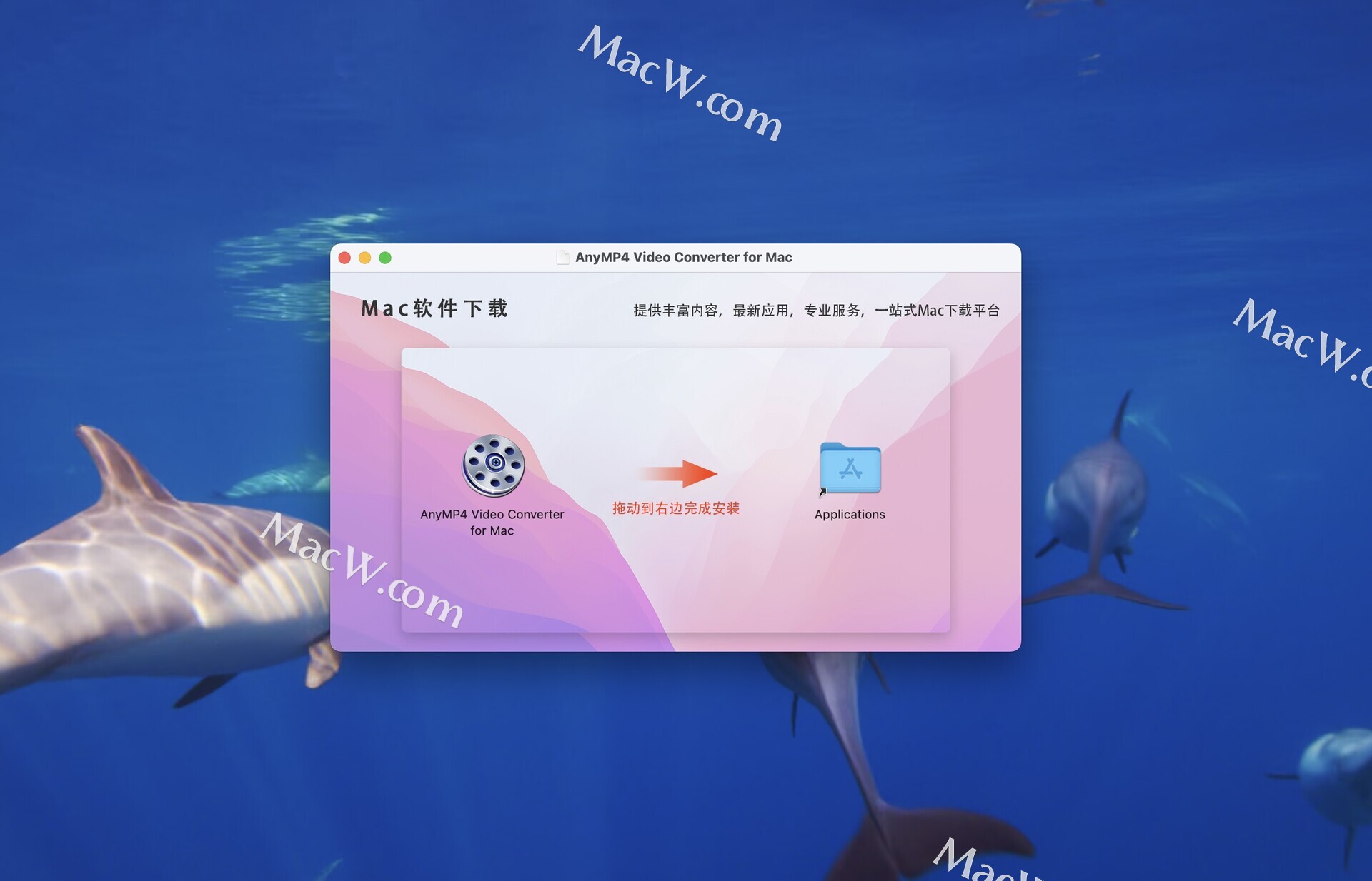 AnyMP4 Video Converter下载完成后打开,拖动左侧的软件到右侧应用程序中即可
