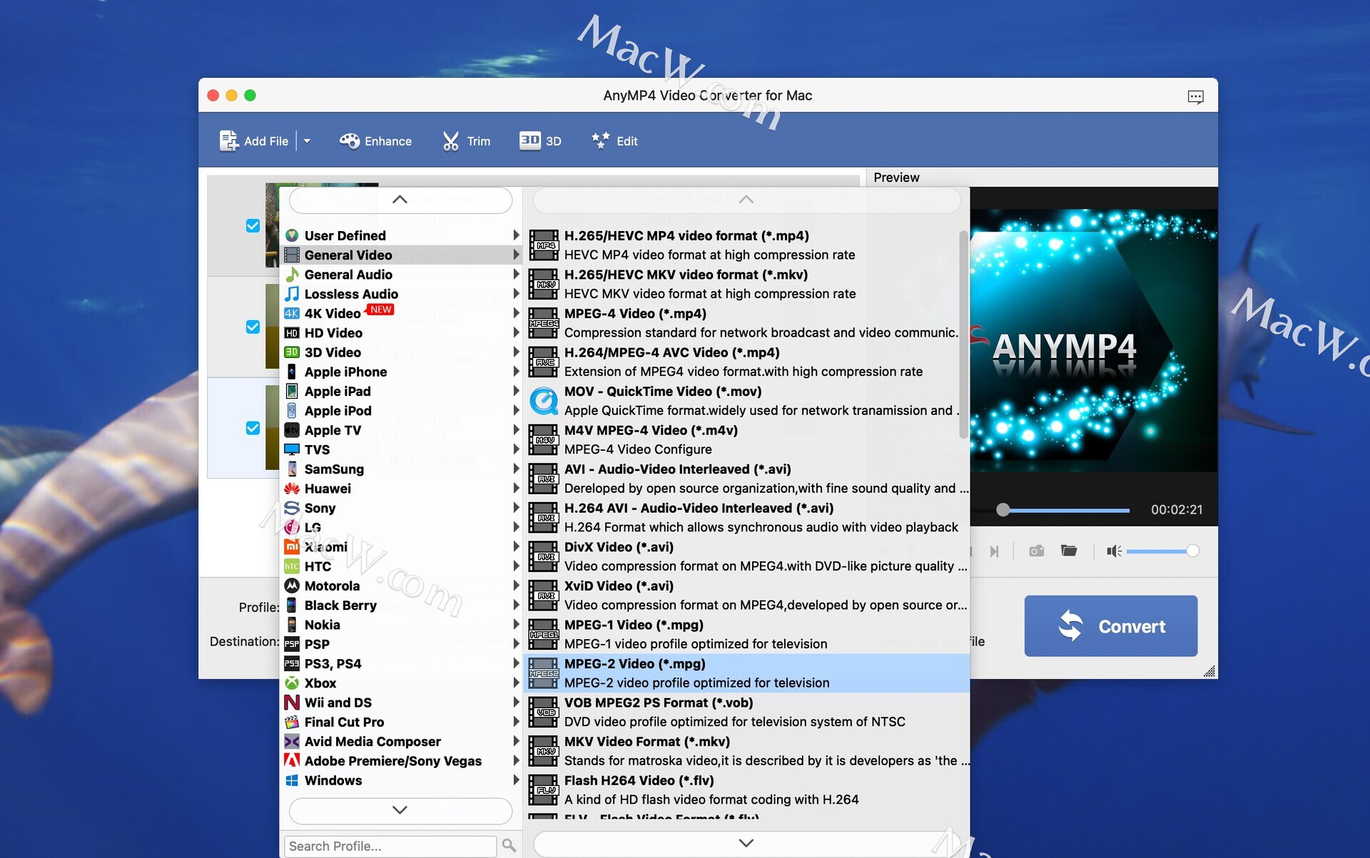 AnyMP4 Video Converter for Mac 有很长的设备支持列表,包括但不限于 iPhone ( iPhone 14/13/13 Pro/13 Pro Max/13 mini/12/12 Pro/12 Pro Max/12 mini/11/11 Pro /11 Pro Max/XS/XS Max/X/XR/8/8 Plus/7/7 Plus/6s/6s Plus/6/6 Plus/SE), iPad (iPad Pro, iPad mini 4,New iPad Pro) , Apple TV, iPod, Samsung Galaxy S8/7/6, Samsung Galaxy Note 5, Samsung Galaxy Tab, Surface Pro, Google Nexus, HTC One M10/9/8, Nokia Lumia series, Moto X, Kindle Fire, NDS, Xbox 360、PSP/PS4 和其他 iOS/Android/Windows 设备。