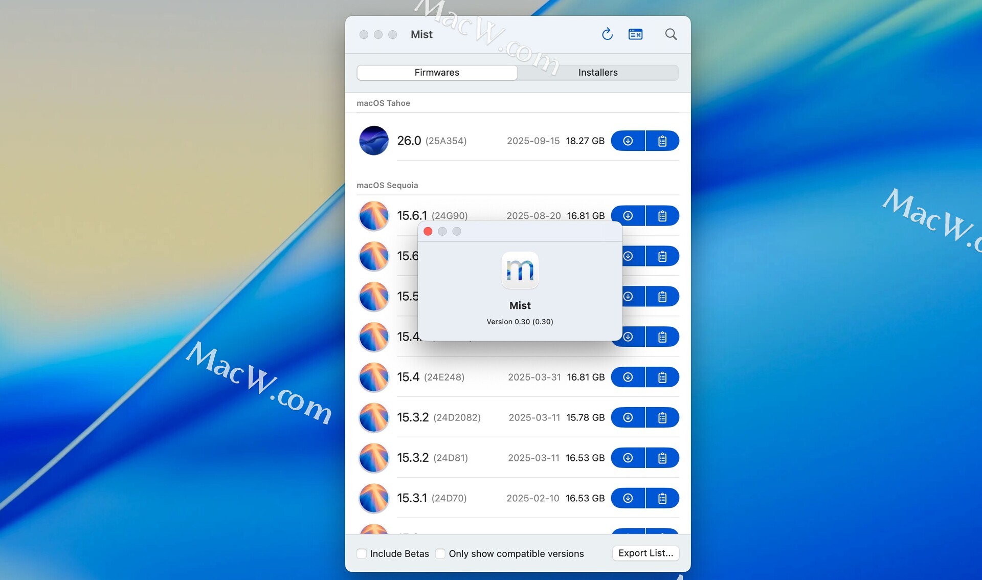 - 直观的用户界面:MIST拥有简洁、直观的用户界面,使用户可以轻松查看所有可下载的macOS固件和安装器信息,包括名称、版本、构建号、发布日期和文件大小等。