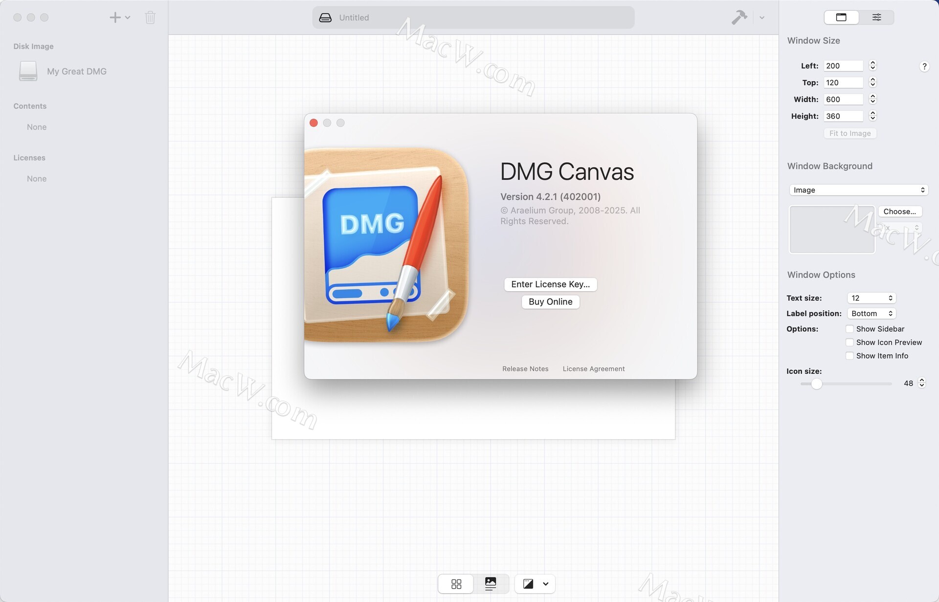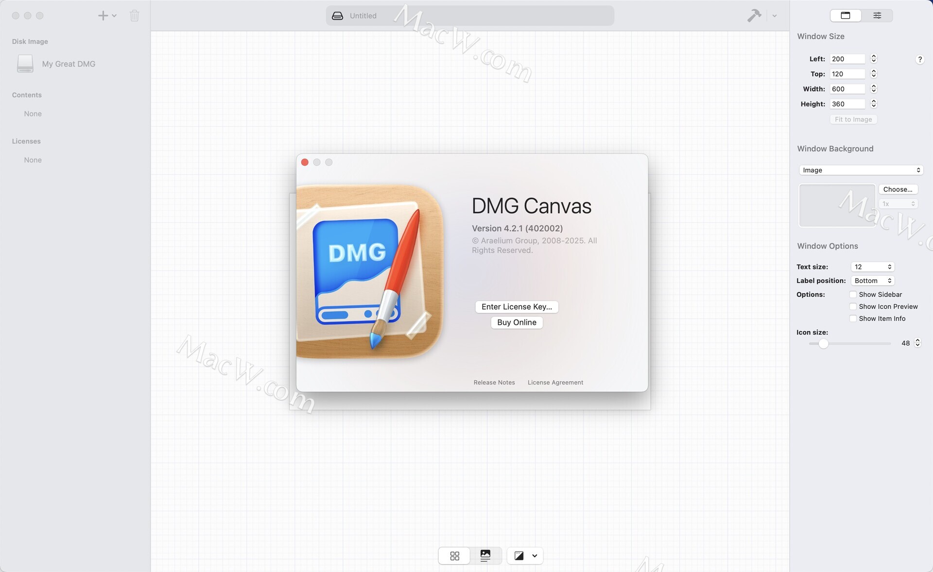 使用背景布局视图,您可以在DMG Canvas内部为您的磁盘映像创建出色的背景。只需放置图像,添加自定义文本,您就可以快速完成。