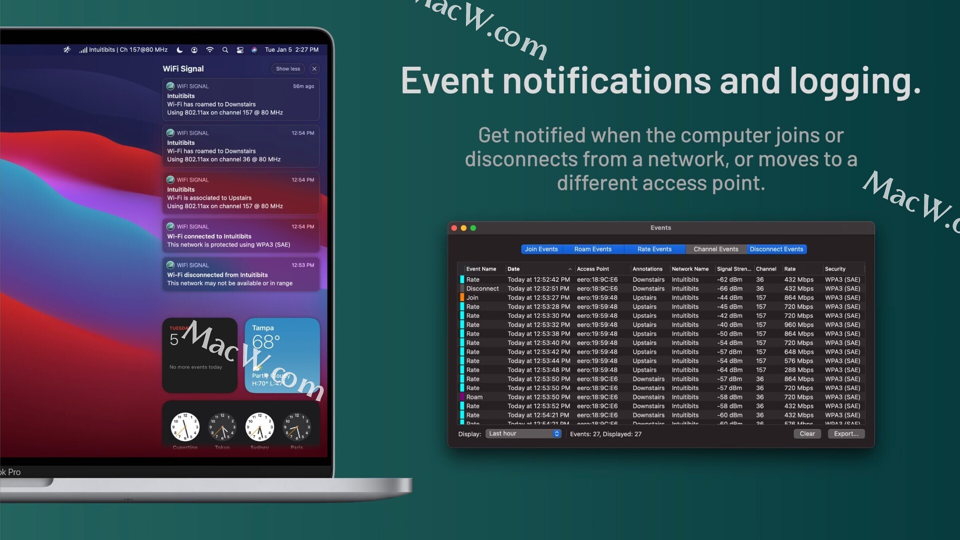 - WiFi信号会记录并通知您常见的Wi-Fi事件,例如计算机加入或断开网络,移动(漫游)到不同的接入点,或检测到传输数据速率或信道配置更改时。另外,如果信号强度或信噪比(SNR)下降到给定阈值以下,您可以选择通知。