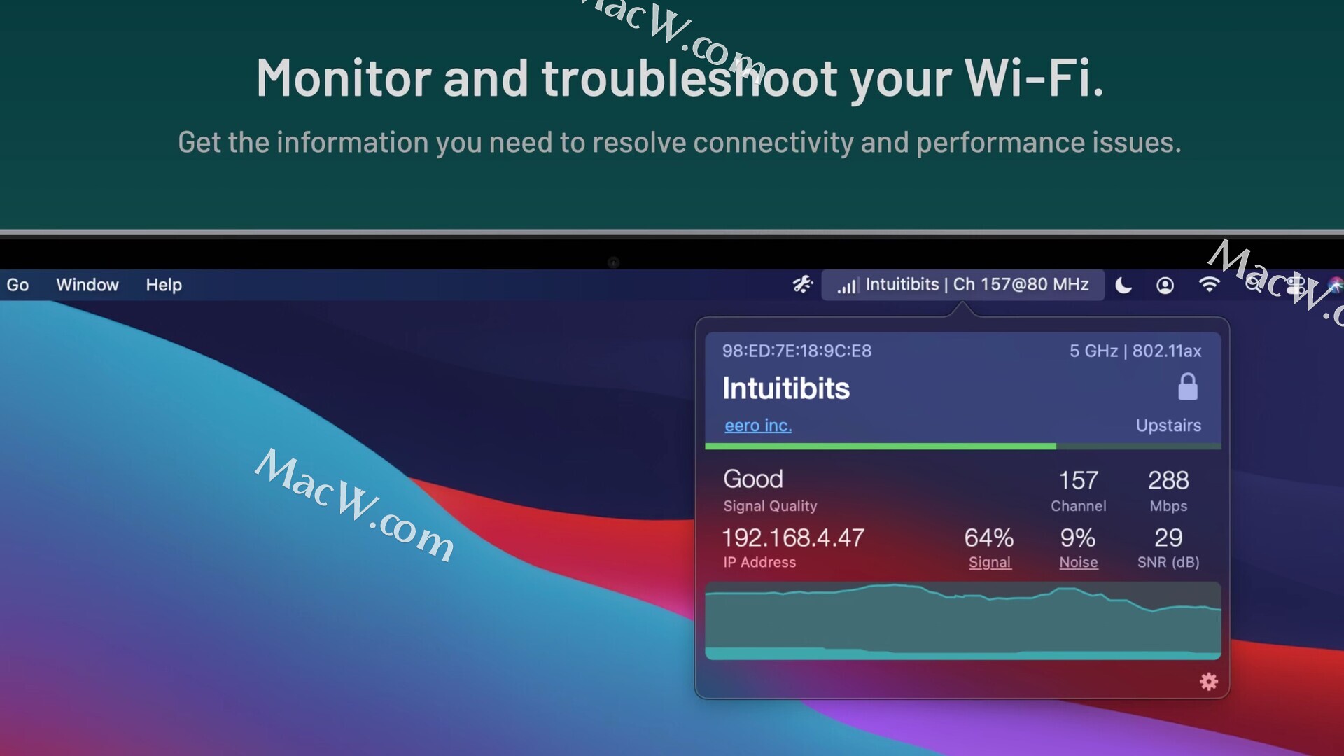 - WiFi Signal是一个系统菜单栏应用程序,可轻松访问您的Wi-Fi连接详情,监视网络的信号质量,并可找到并推荐备用频道,以避免与附近无线网络发生冲突或信号重叠,从而影响连接和连接的性能。