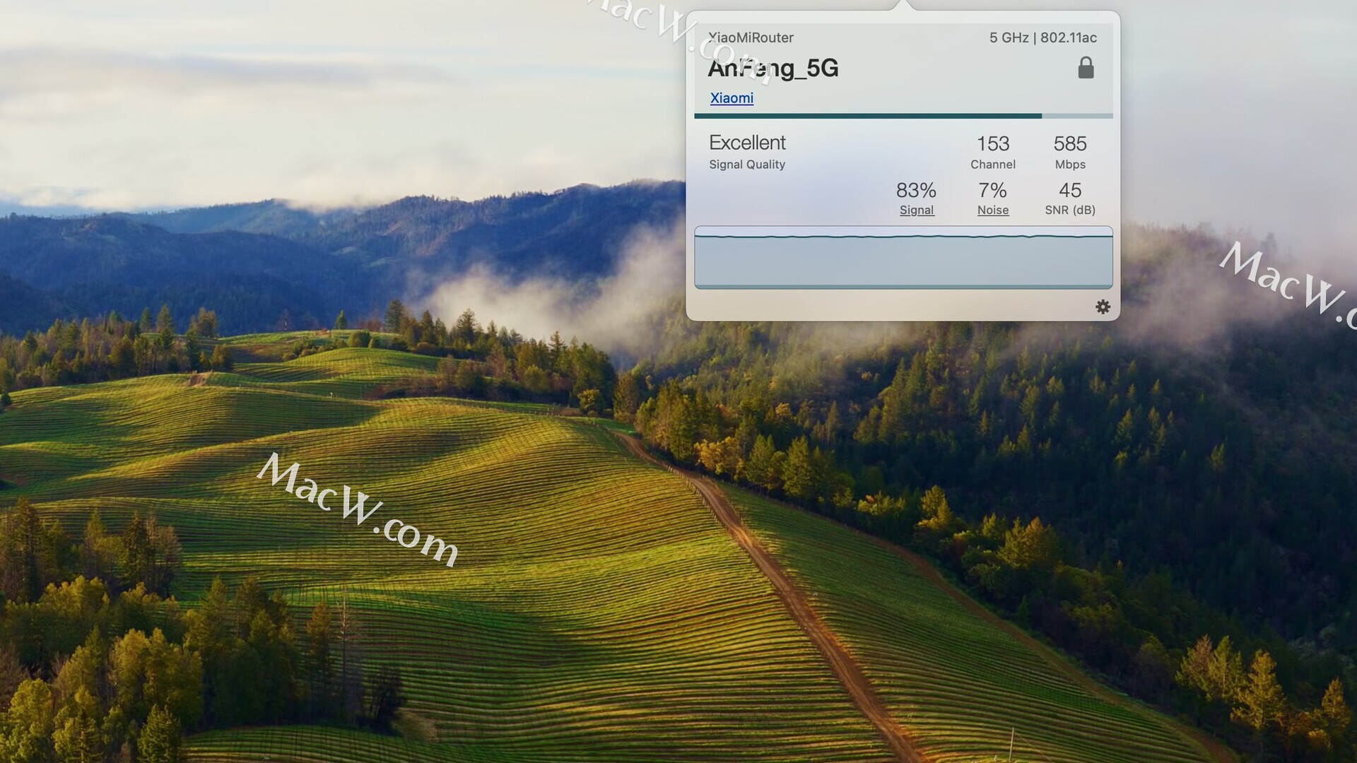 WiFi Signal Mac版是一款位于系统菜单栏wifi信号管理工具,可以轻松访问您的Wi-Fi连接的详细信息(名称,频道,传输速率,信号强度,噪声等),监控您的无线网络的信号质量,并能找到和建议为您的网络的替代渠道,从而避免信号重叠,渠道冲突。测试环境:MacOS 13.5