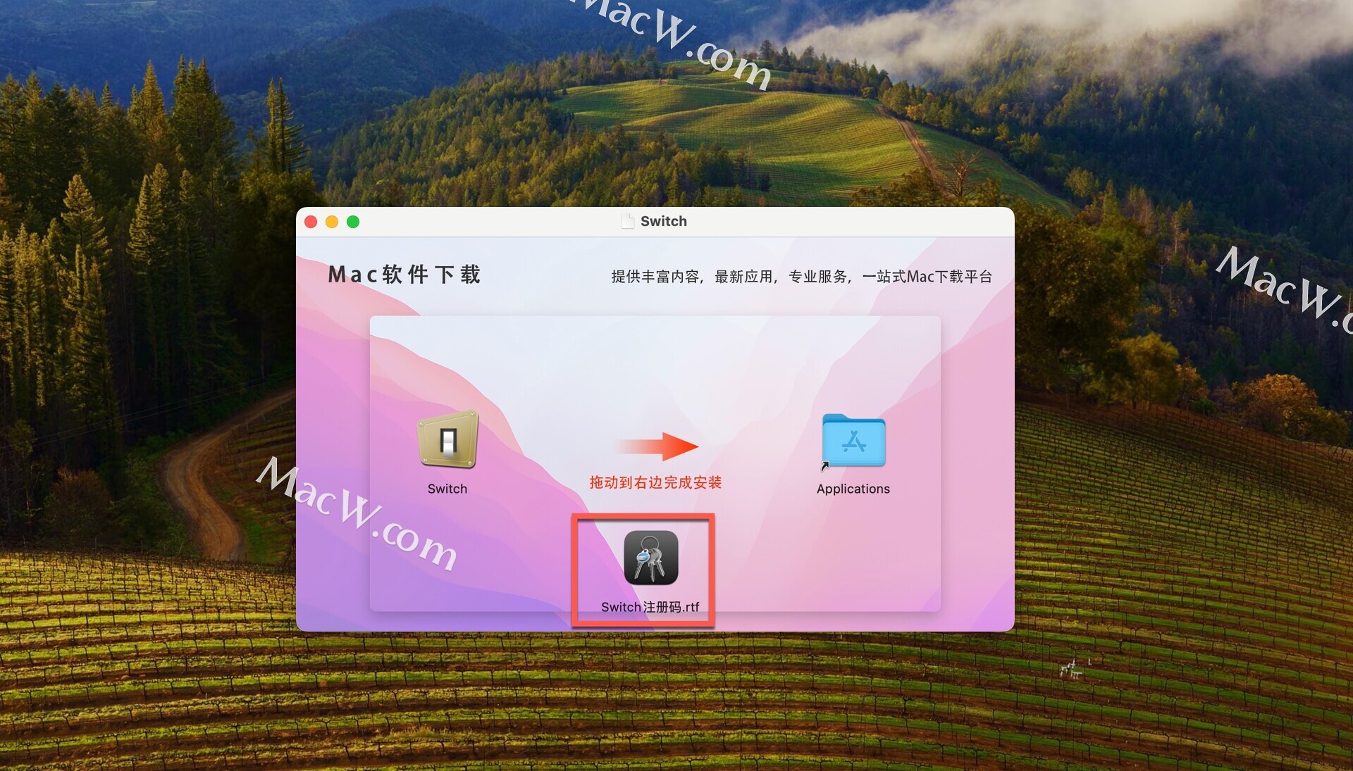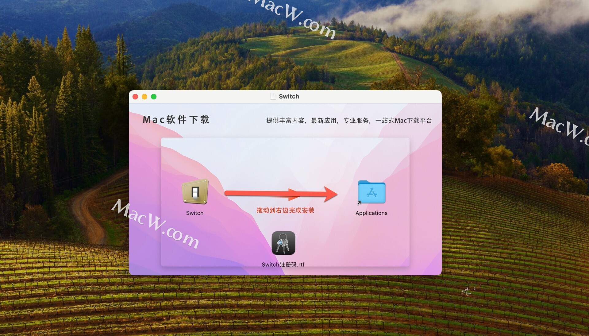 安装包下载完成后,拖动Switch到右侧应用程序中即可。