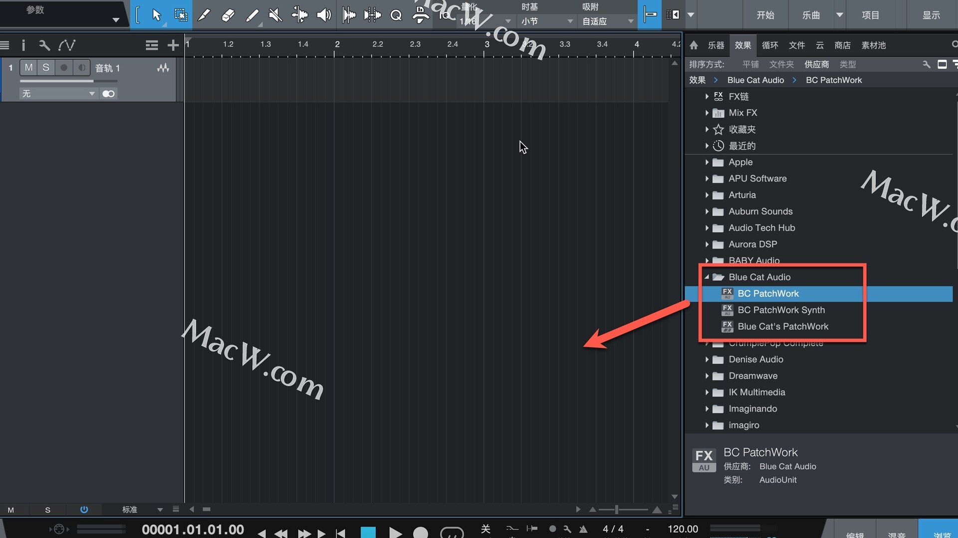 Blue Cat PatchWork插件在应用程序中可以使用,也可以在studio one效果器下方找到,拖动到左侧即可使用如图: