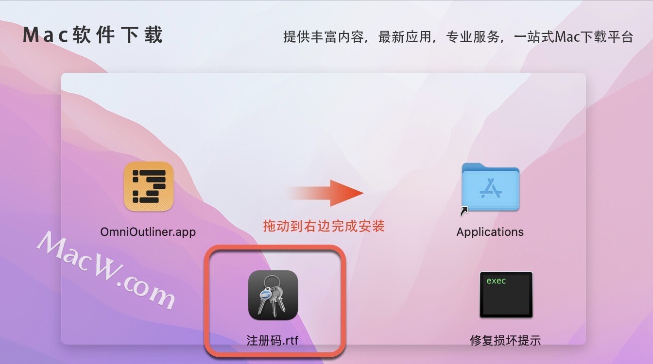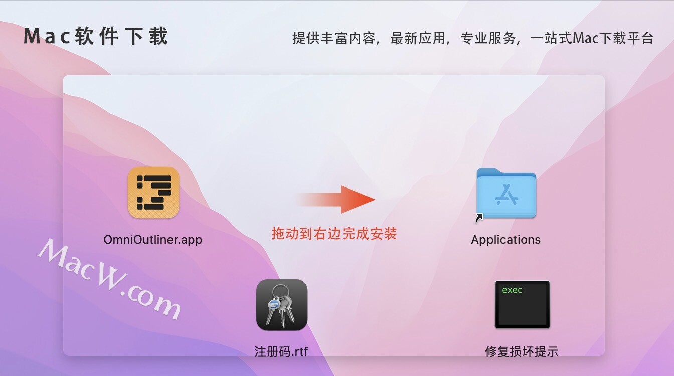 软件下载完成后,拖动左侧的OmniOutliner到右侧应用程序中