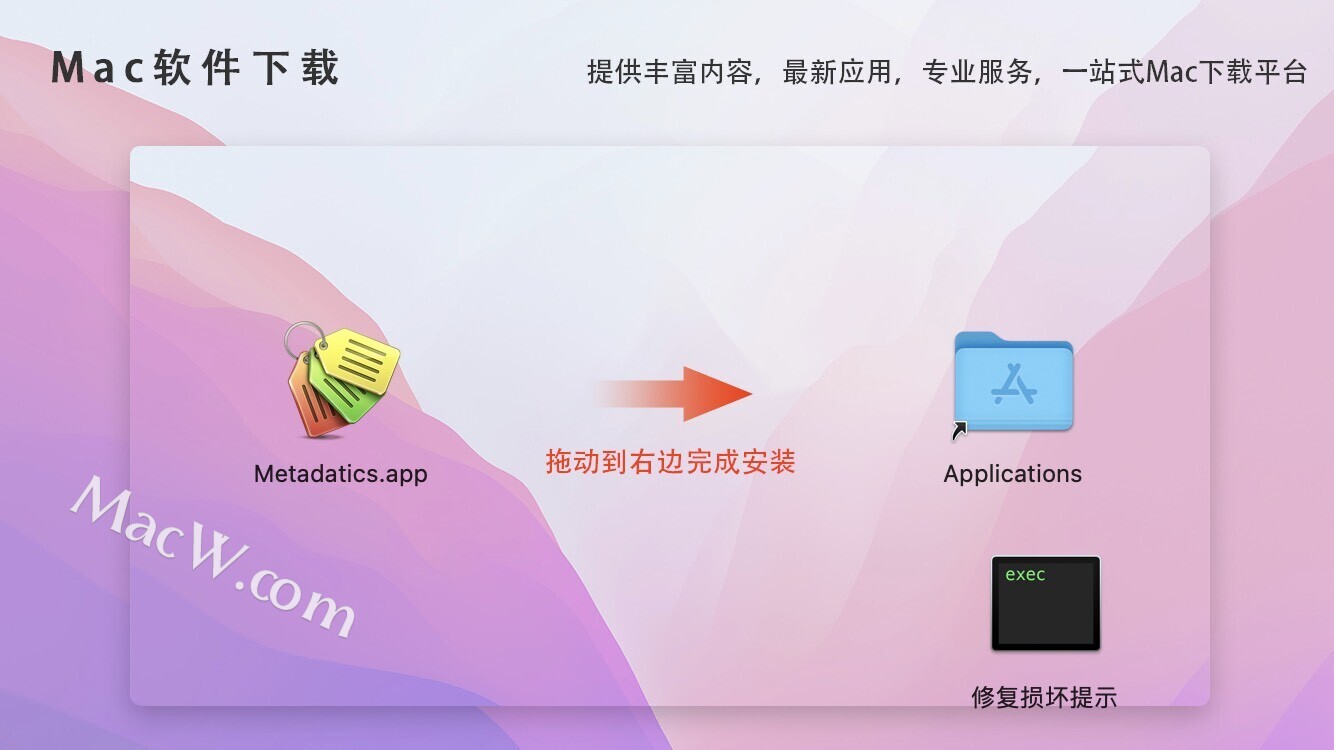 安装包下载完成后打开,拖动左侧的Metadatics软件到右侧应用程序中即可