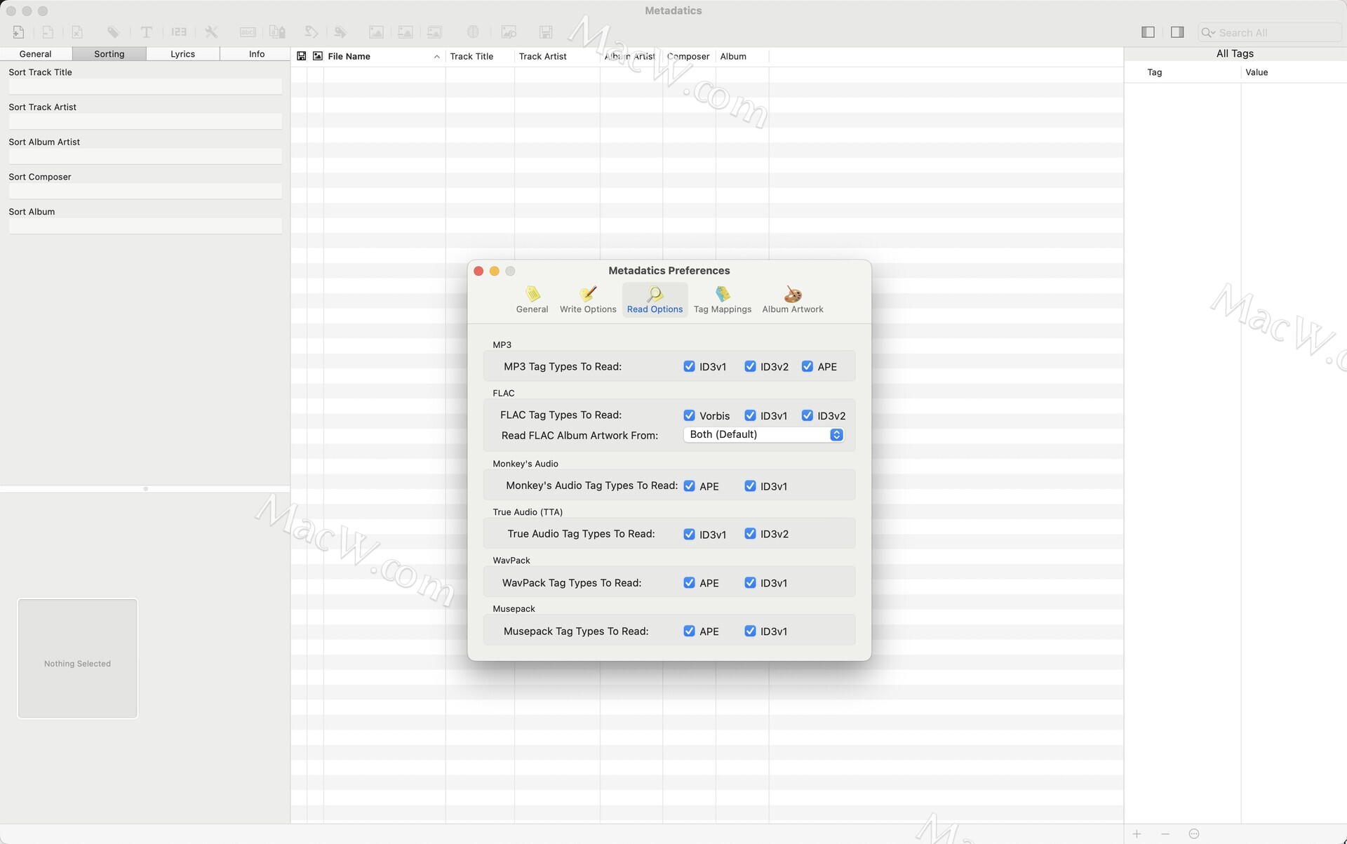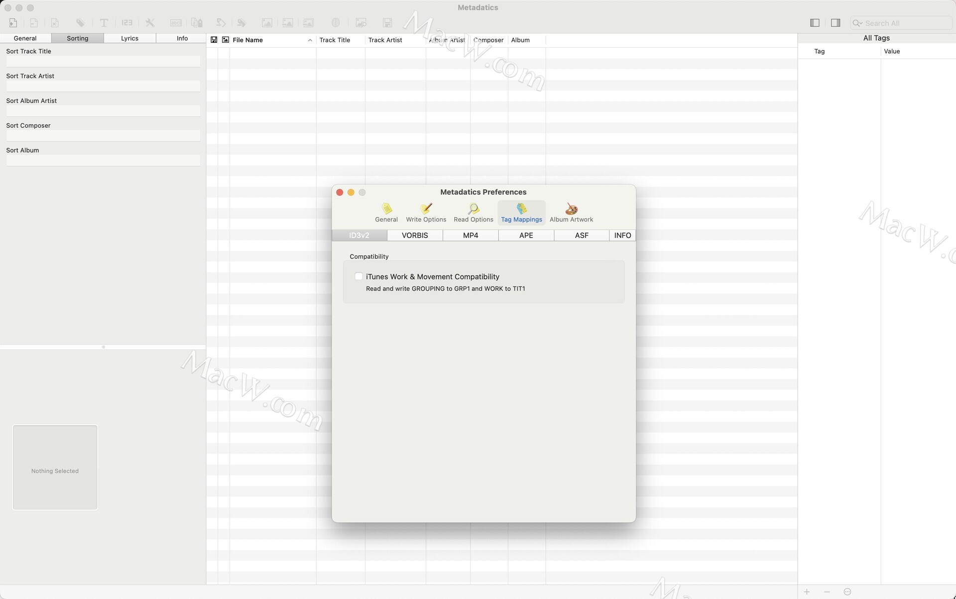 Metadatics支持读写各种音频文件类型的ID3v1,ID3v2,MP4,Vorbis,APE和ASF标签。