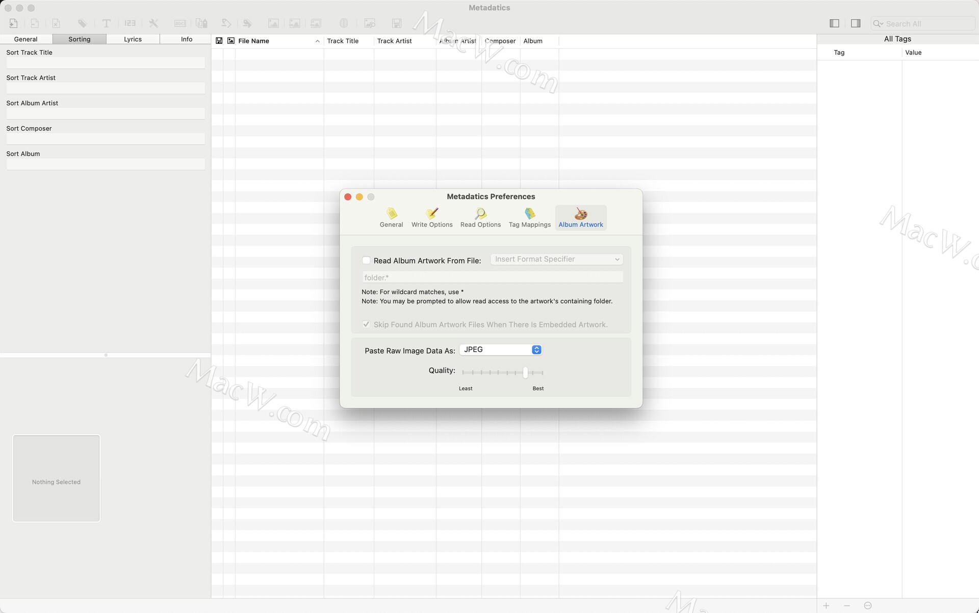 Metadatics完全支持专辑封面,包括多个图像。可以提取图稿并将其另存为单独的图像文件。您还可以从包括Amazon在内的在线资源中搜索艺术品。