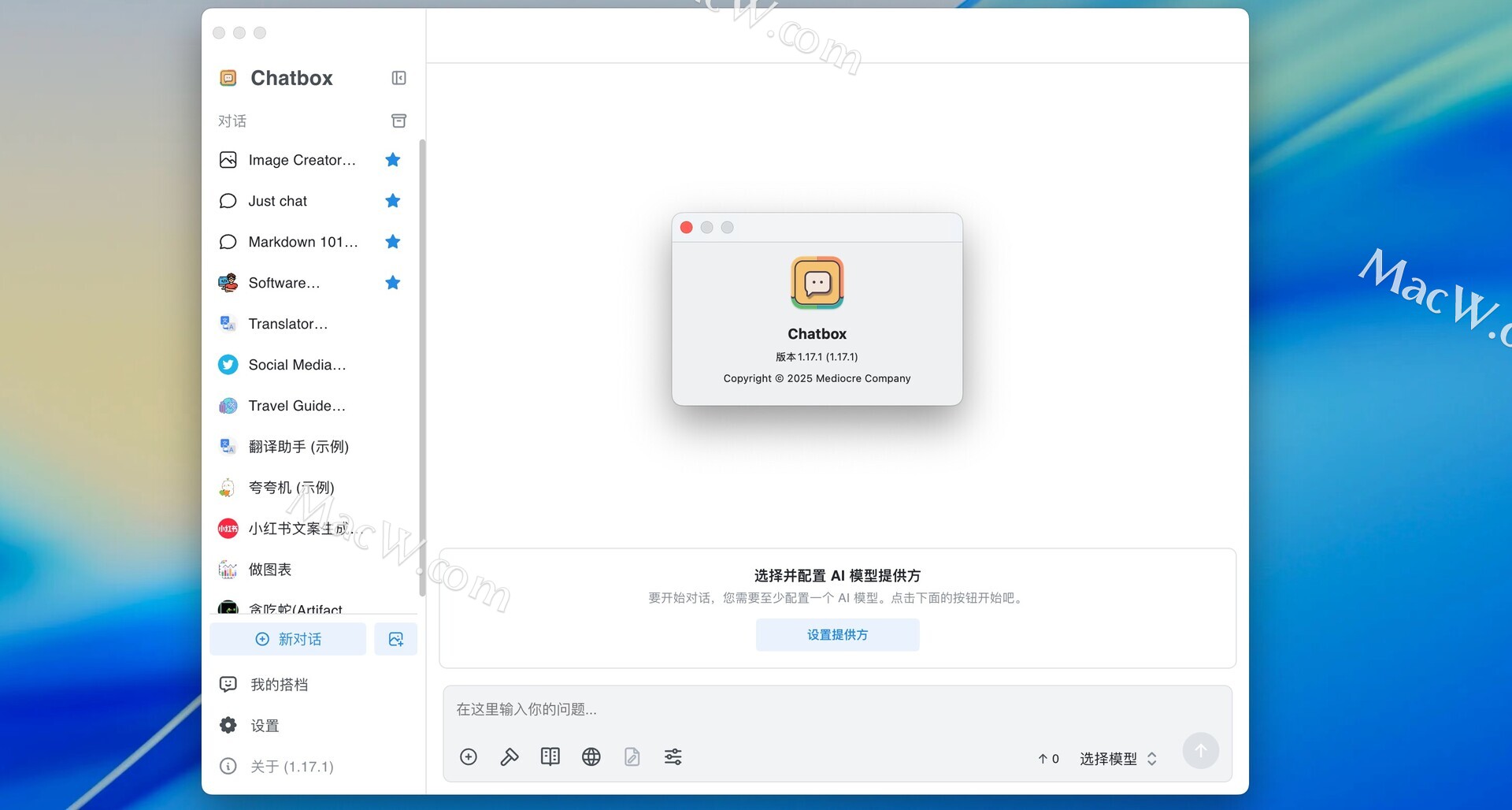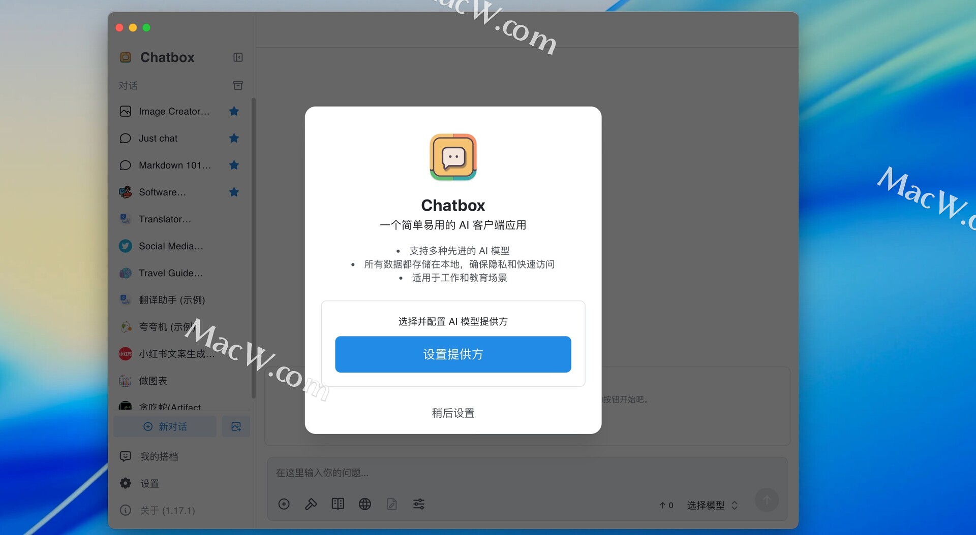 chatbox for mac一款 AI 客户端应用和智能助手,支持众多先进的 AI 模型和 API,它兼容的 API 接口支持包括 OpenAI、Claude、Google Gemini、Ollama、Azure等。