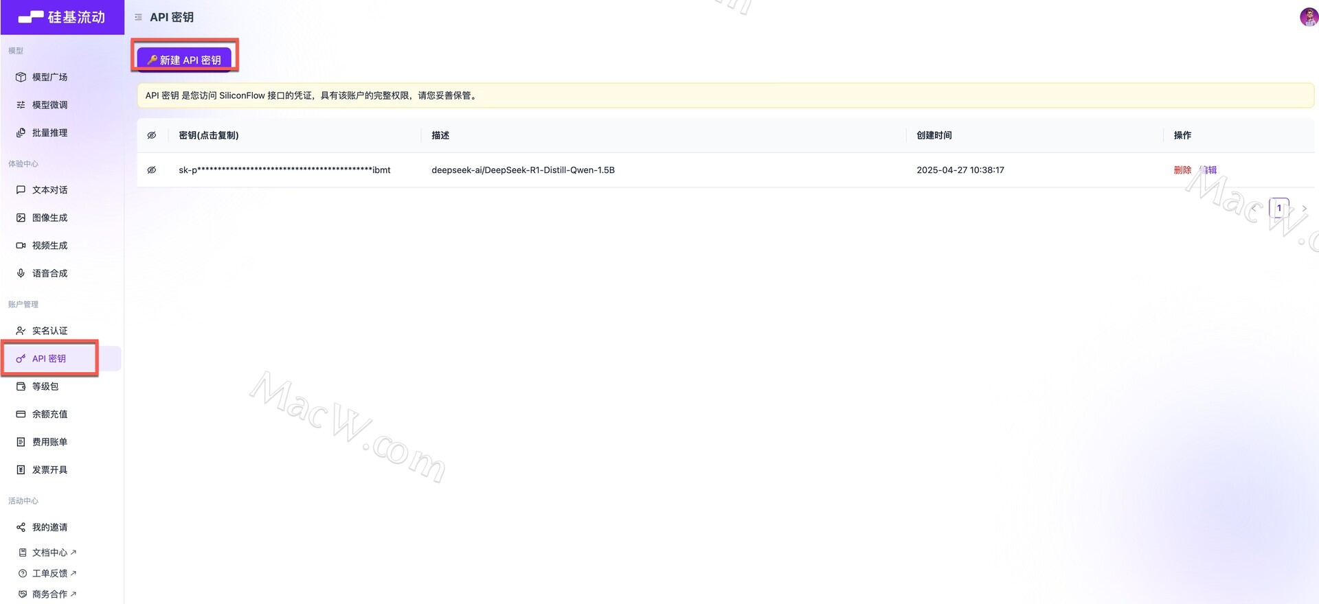 注册 SiliconFlow 账号并登录后,可以在页面的左下角找到 账户管理 → API 密钥,点击 新建 API 密钥,然后复制这串密钥在后面备用。