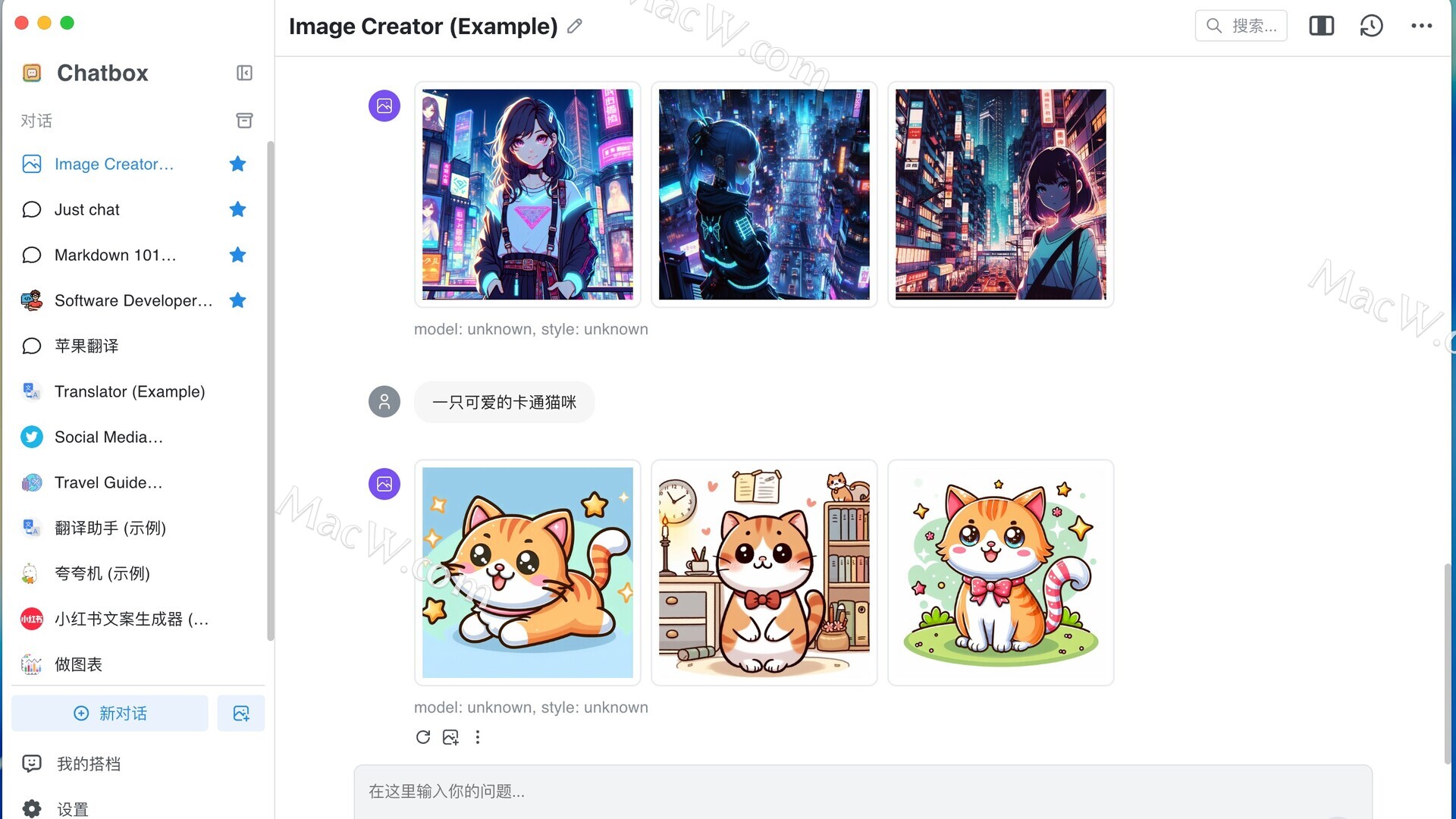 使用 Chatbox 的图像生成功能将您的想法变为现实。只需描述您的愿景,并观看我们的 AI 将您的文字转化为令人惊叹的视觉效果。 LaTeX 和 Markdown 渲染