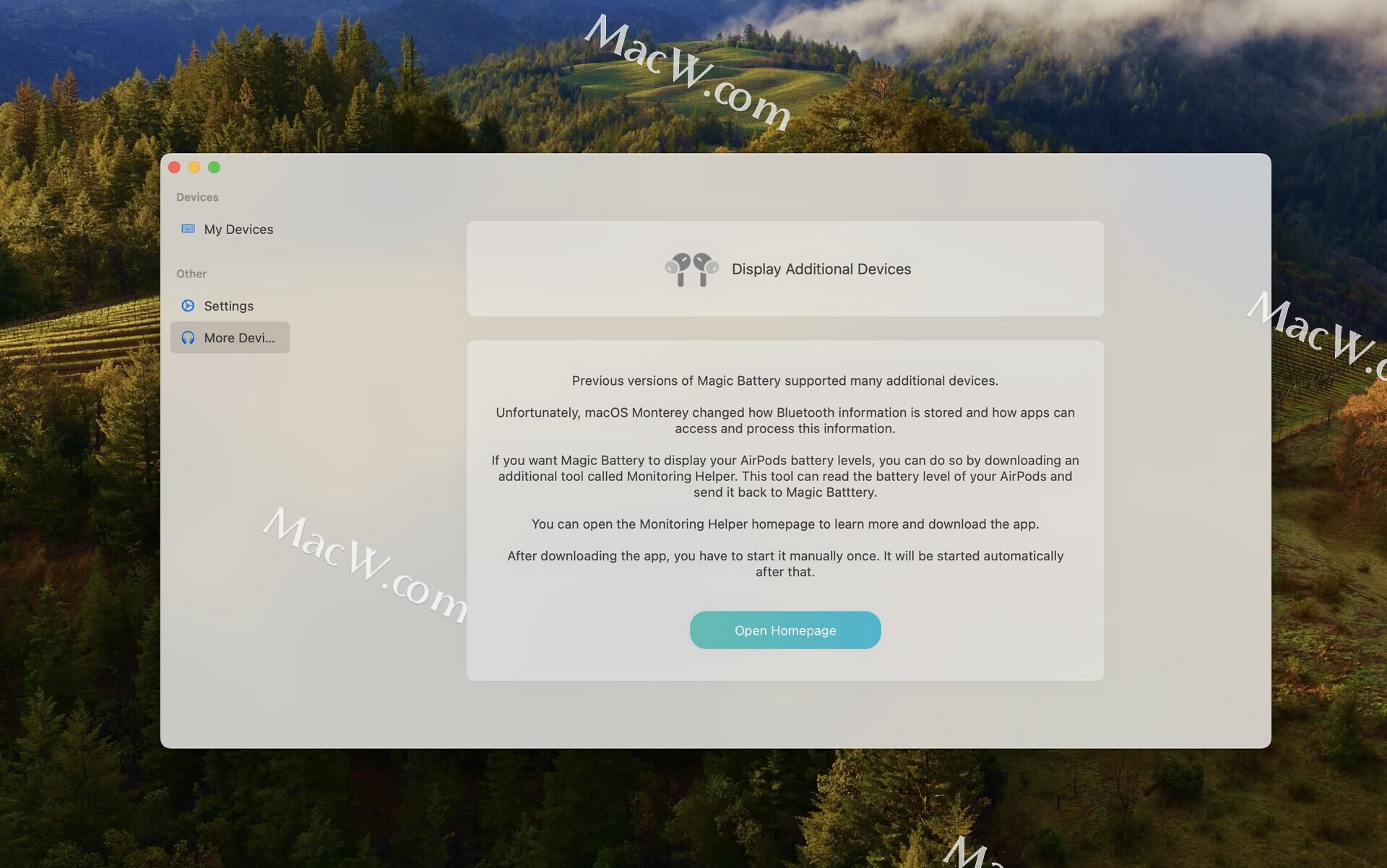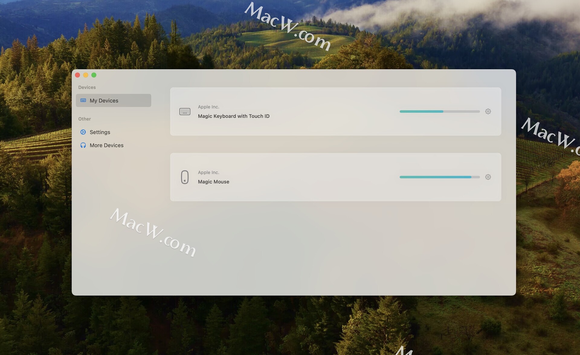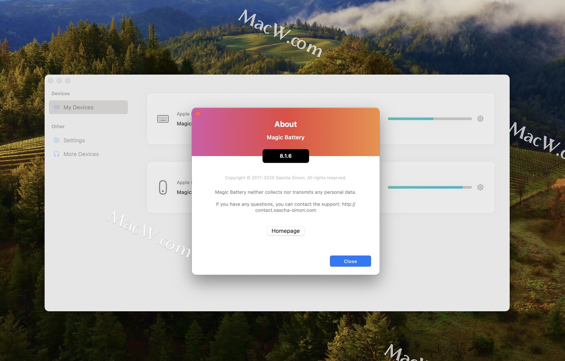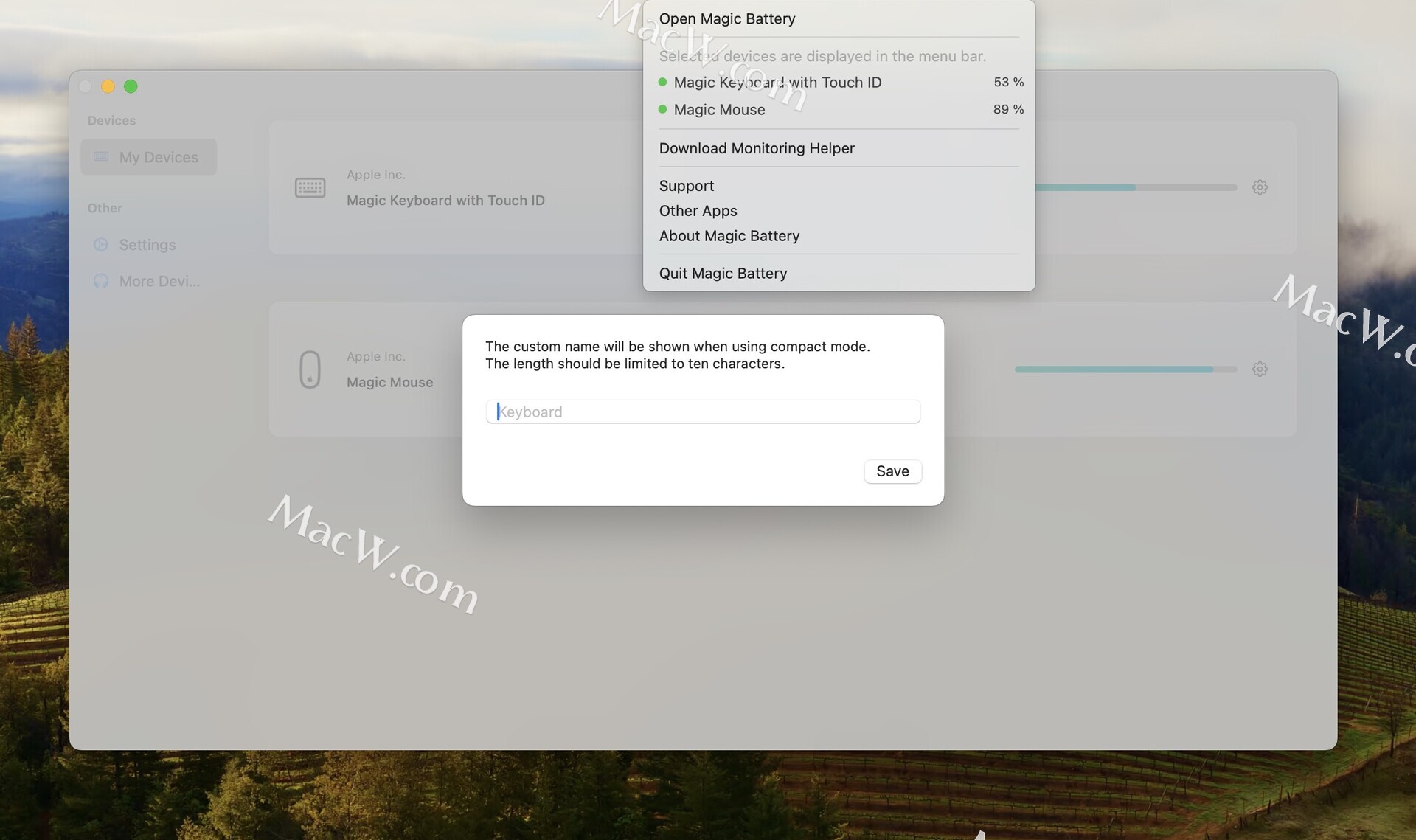想要随时掌握苹果设备电量吗?Magic Battery for mac是您不错的选择。App Magic Battery可以在菜单栏中显示通过蓝牙连接的受支持输入设备和耳机的电池电量。它还支持内部电池。