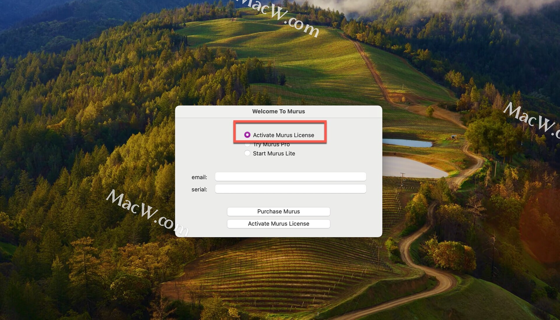 运行Murus Pro ,弹出欢迎使用Murus Pro页面,点击Activate Murus License