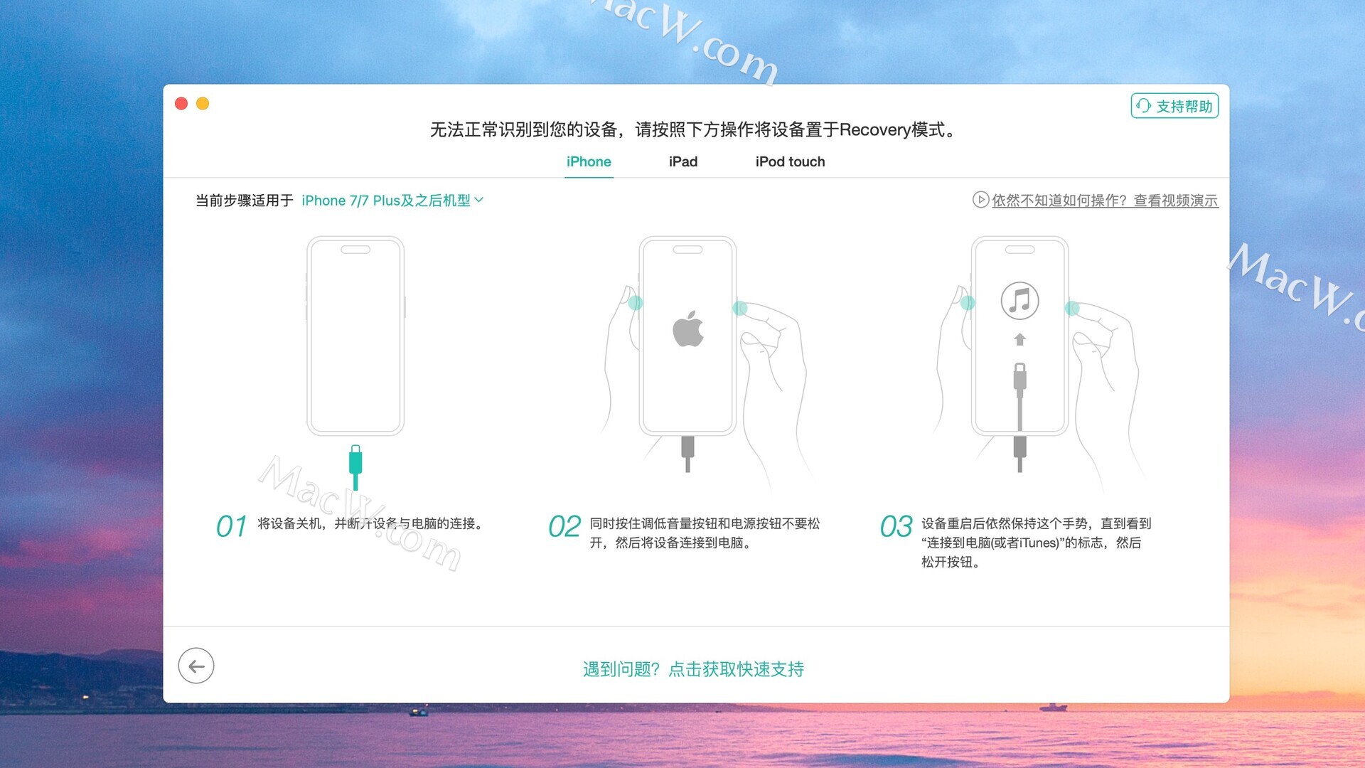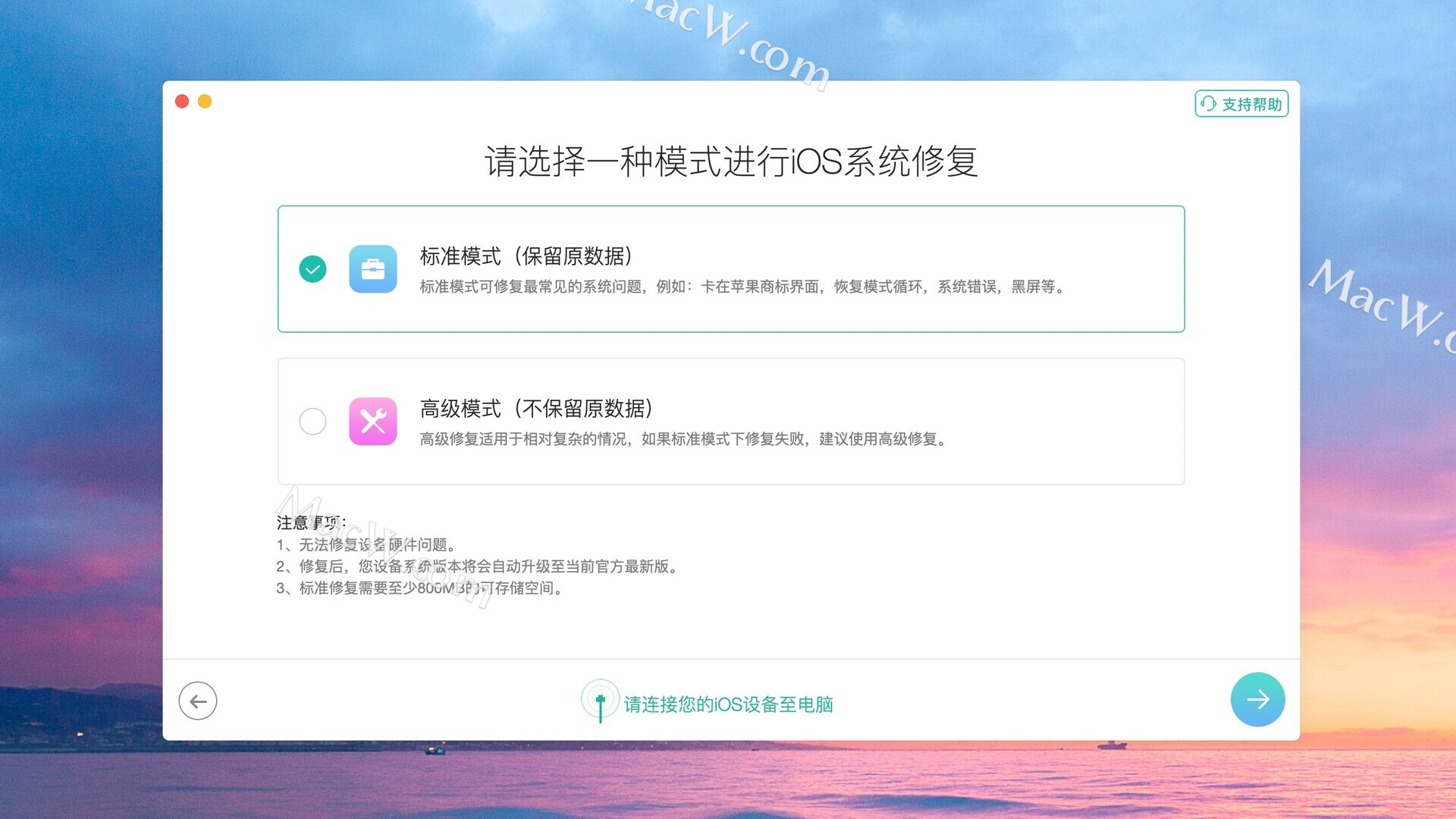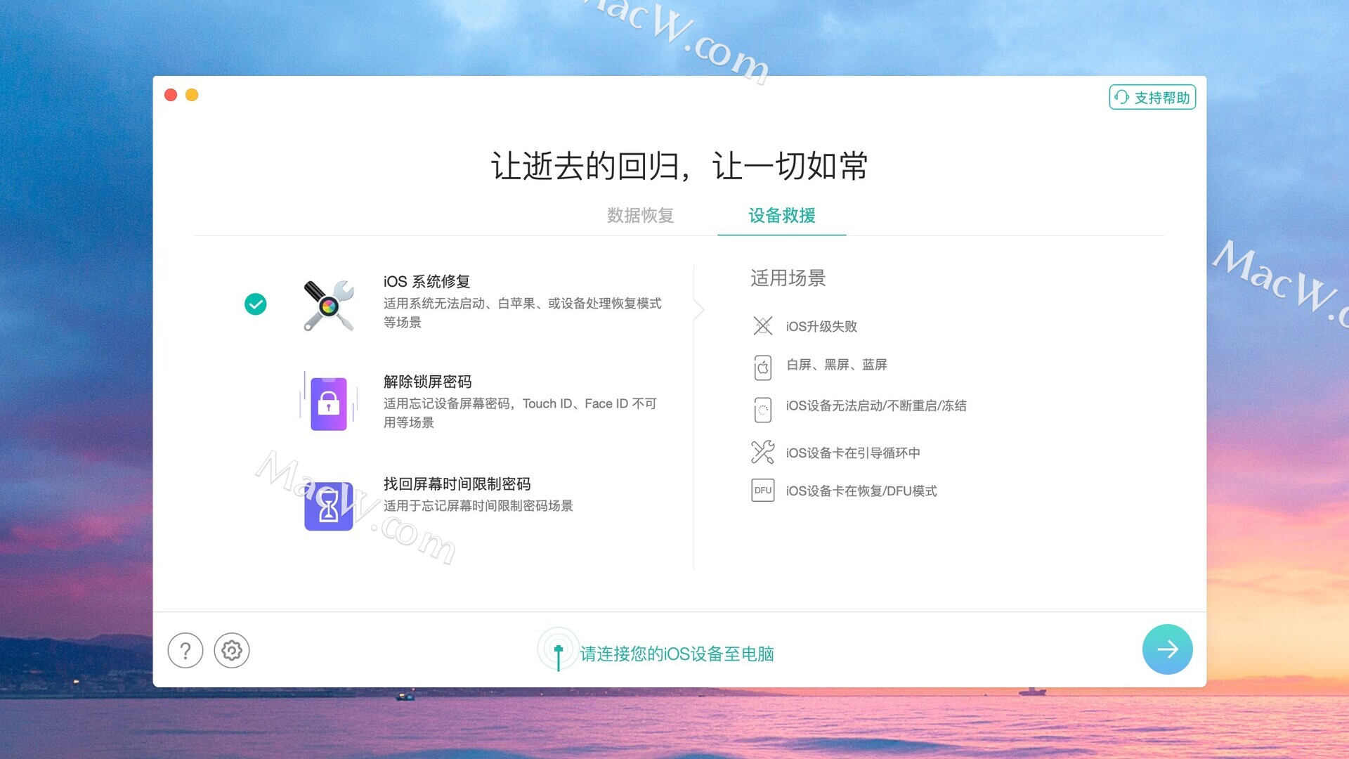 修复系统问题:提供修复功能,能够解决设备的系统问题,例如卡在 Apple 标志、开启不了机等。