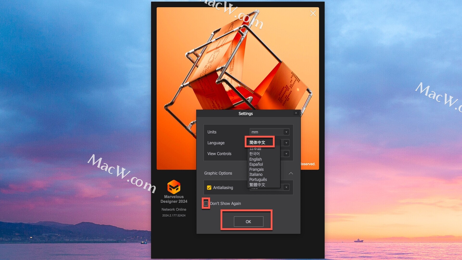 在弹出的Settings窗口中,Language下选择简体中文勾选Don't show Again点击OK,即可使用软件