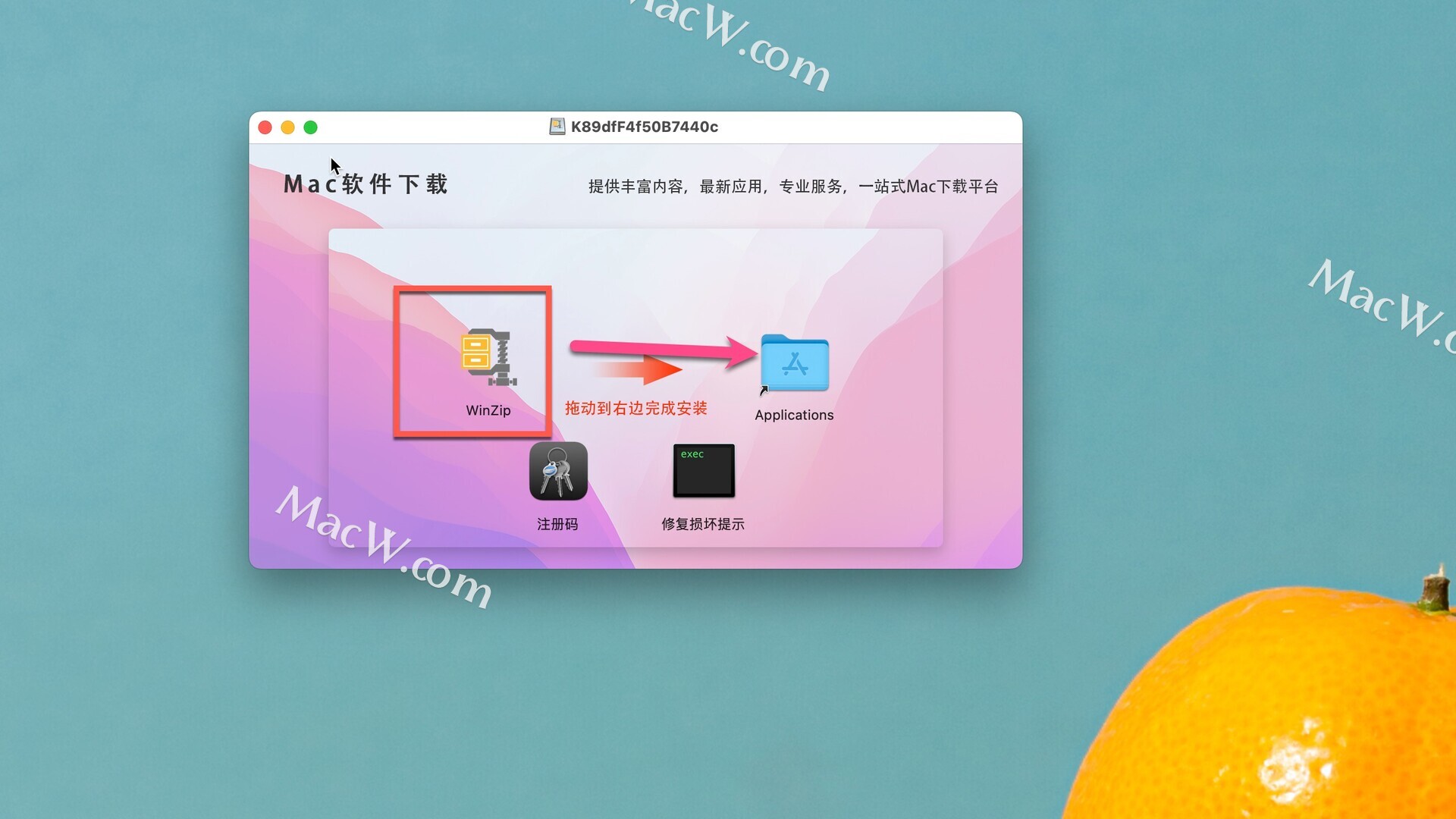 WinZip for mac 破解版软件包下载完成后打开,将左侧的WinZip拖到右边的应用程序中进行安装