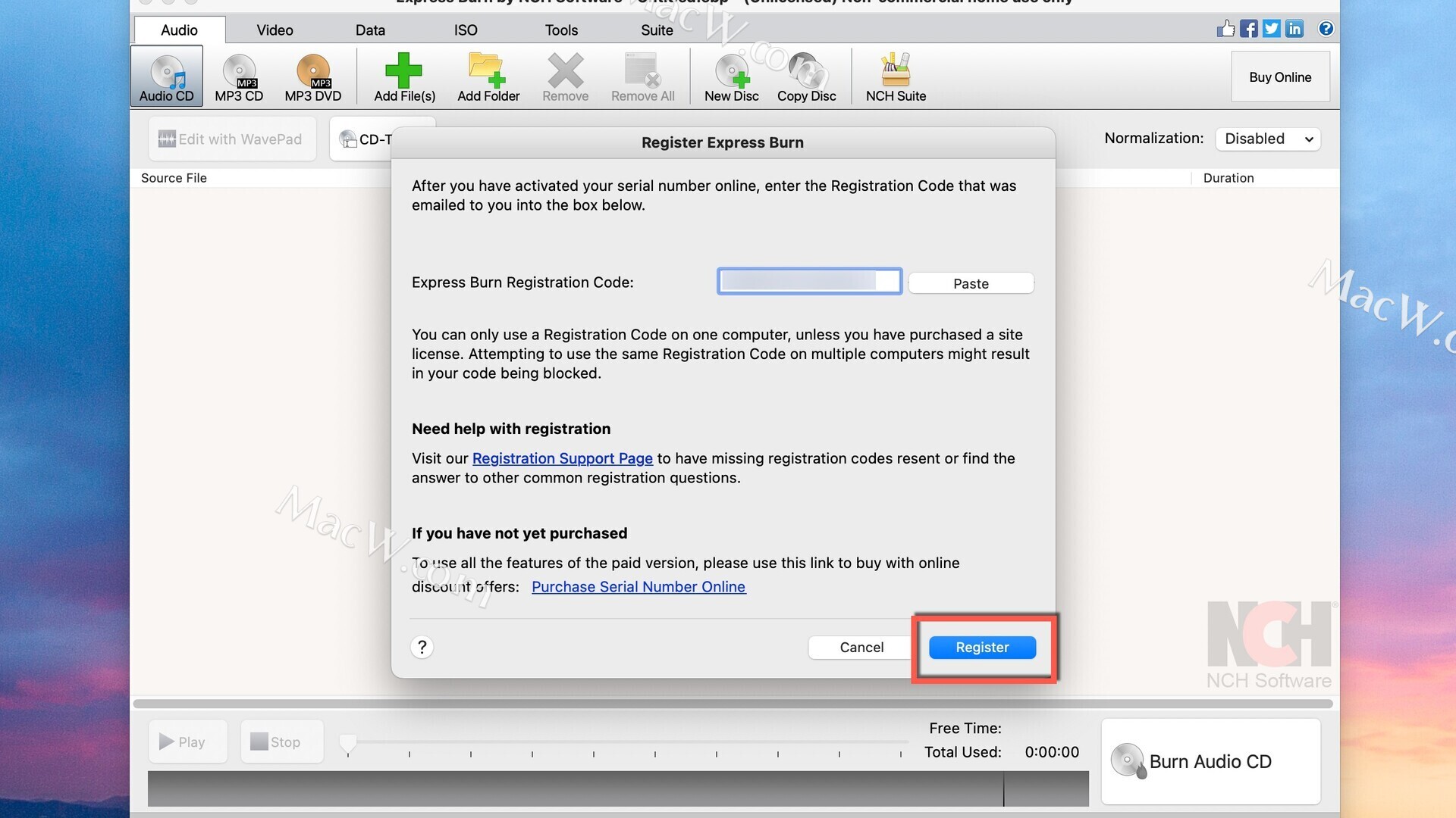 将ExpressBurn注册码复制到对应位置,(点击Paste即可粘贴注册码)然后点击Registear即可激活成功