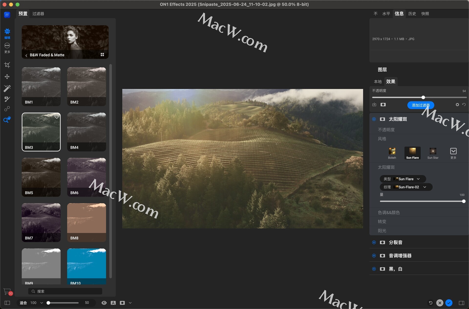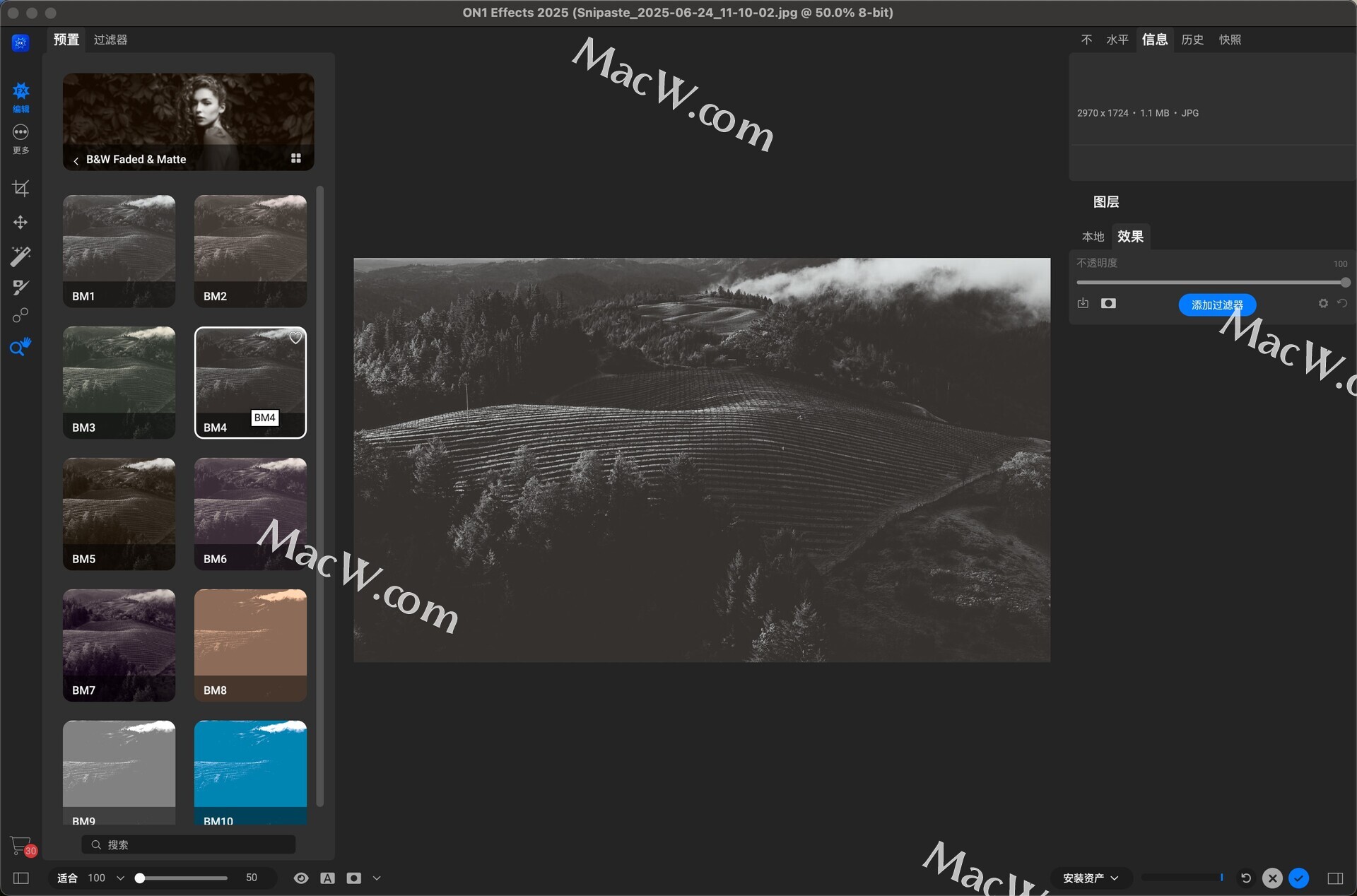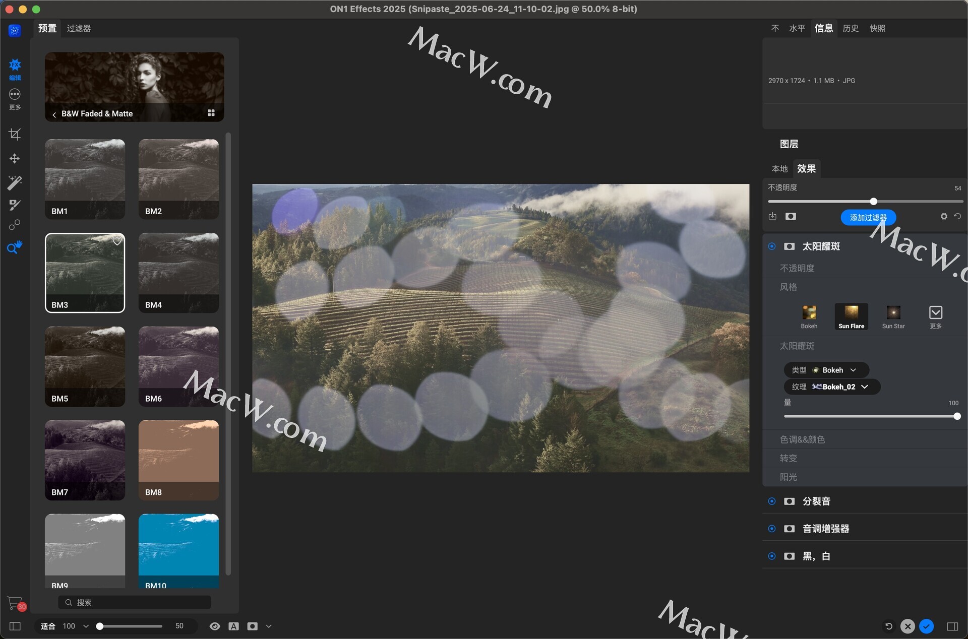 ON1 Effects 2025也提供了Mac版,可以在Mac系统上使用。它的功能和Windows版基本相同,同样基于人工智能技术,提供了丰富的滤镜、效果和调整选项,可以帮助用户轻松地增强照片的色彩、明暗、对比度等方面,实现更加出色的照片效果。同时,ON1 Effects 2023还支持多种图片格式,如JPEG、RAW、PNG等,并且可以自动识别照片中的主体,从而为用户提供更加准确的后期处理效果。此外,ON1 Effects 2025 Mac版同样具有简单易用的界面和直观的操作方式,可以让用户快速上手并完成高质量的照片后期处理。测试环境:MacOS 15.0