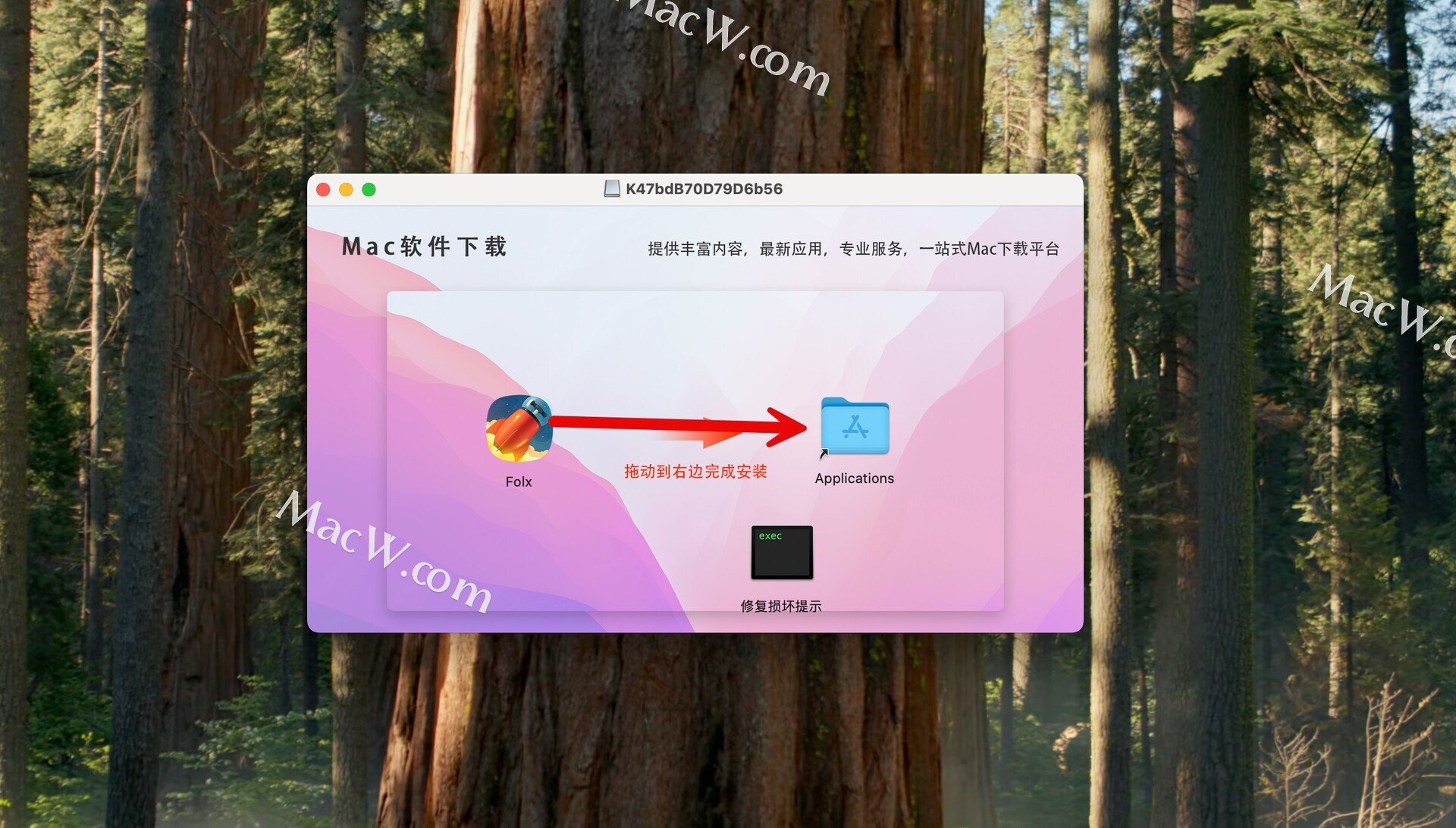 下载完成后,打开安装包,将左侧的软件拖动到右侧应用程序即可。