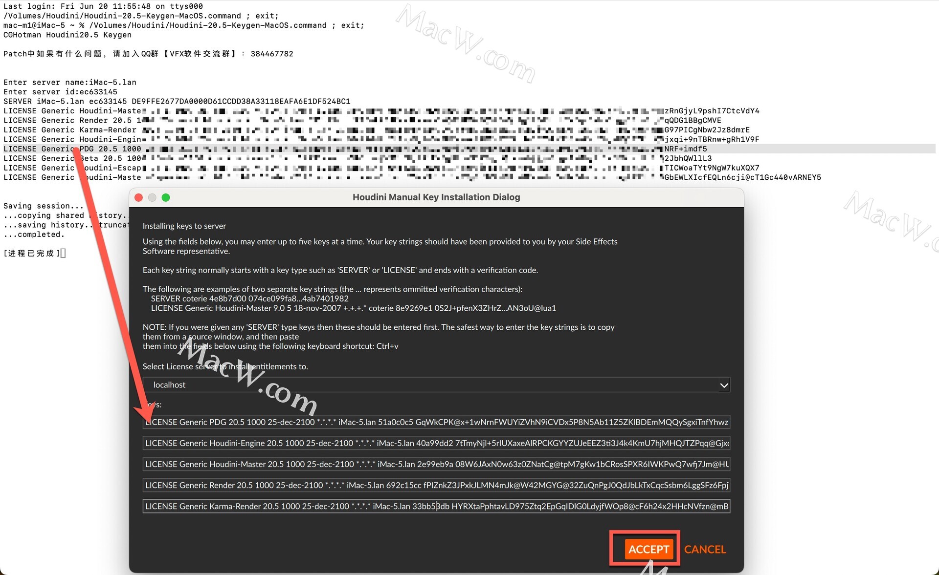 将许可证粘贴到“密钥”字段,一一对应(粘贴5条即可),点击Accept