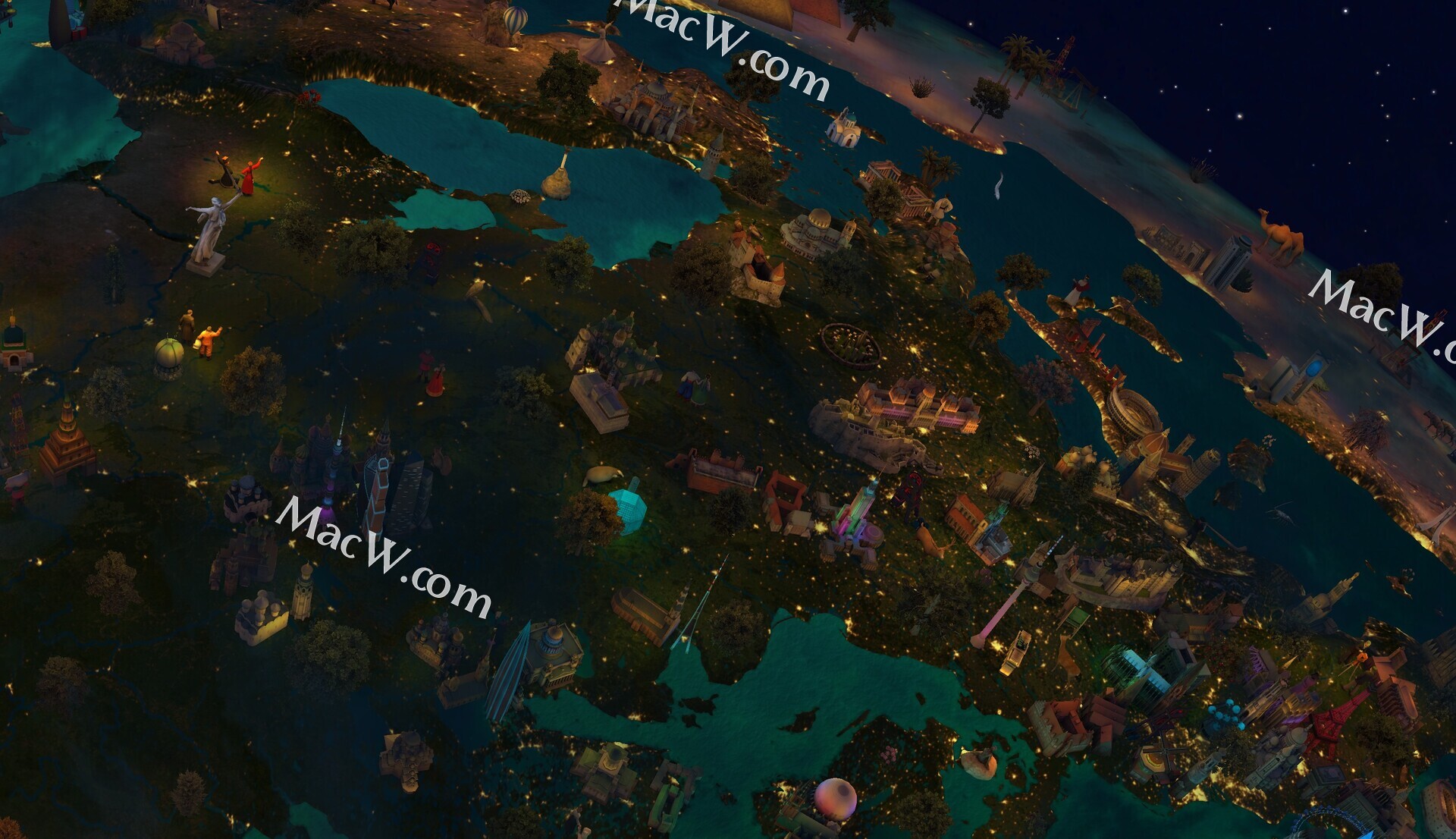 “世界奇观”扩展的功能: • 靠近地球表面的低空摄像机水平 • 全球建筑和自然地标 • 不同文化和历史人物的代表 • 自然栖息地的动物、鸟类和海洋生物 • 树木和植被