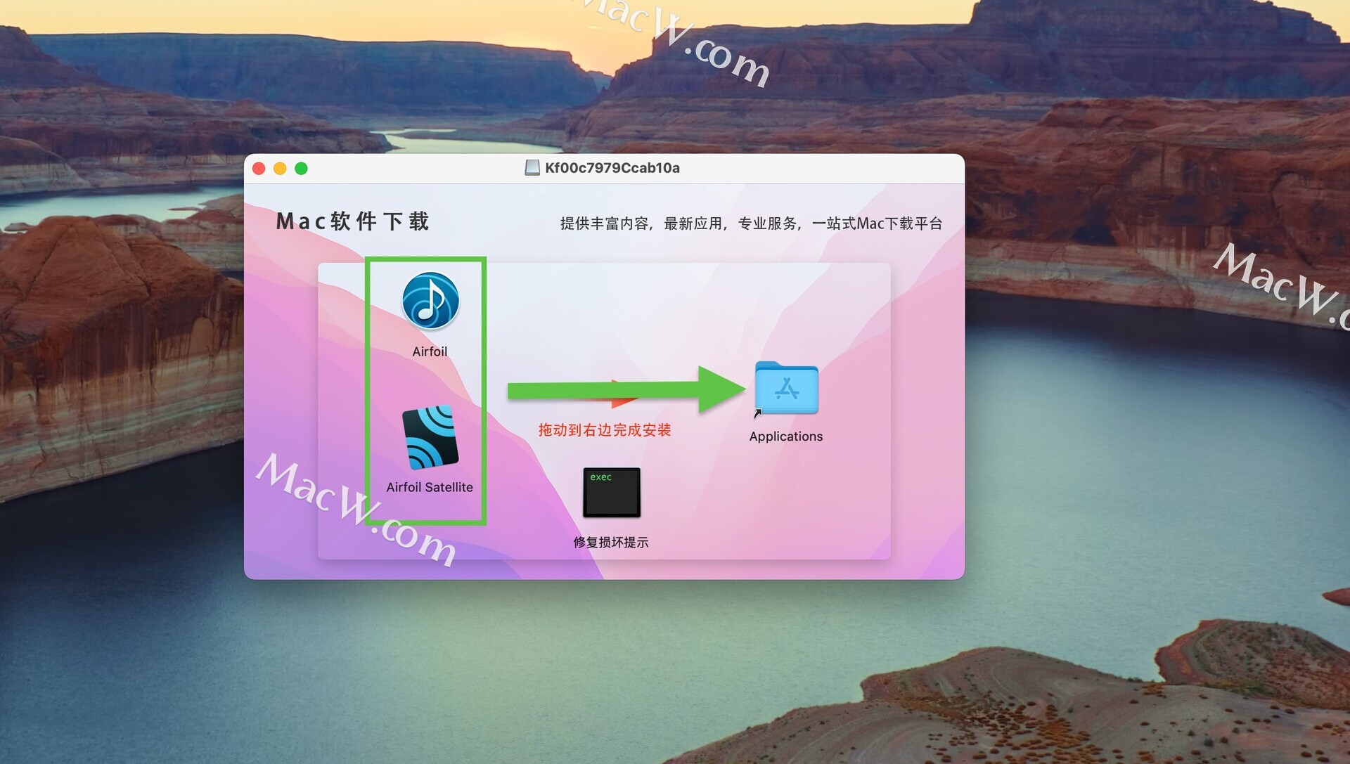airfoil 5 for Mac版下载完成后打开,将左侧Airfoil和Airfoil Satellite都拖入右侧应用程序中进行安装即可完成