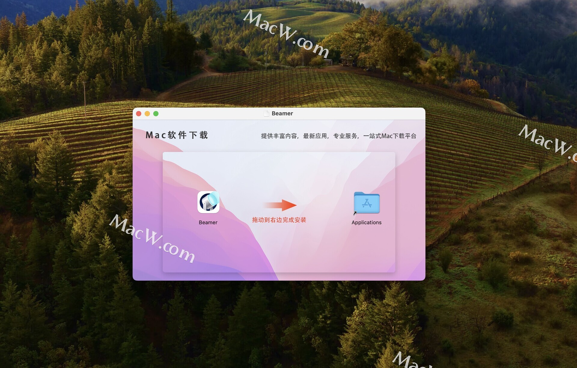 软件下载完成后,打开软件包如下图,拖动软件【Beamer】到应用程序安装.