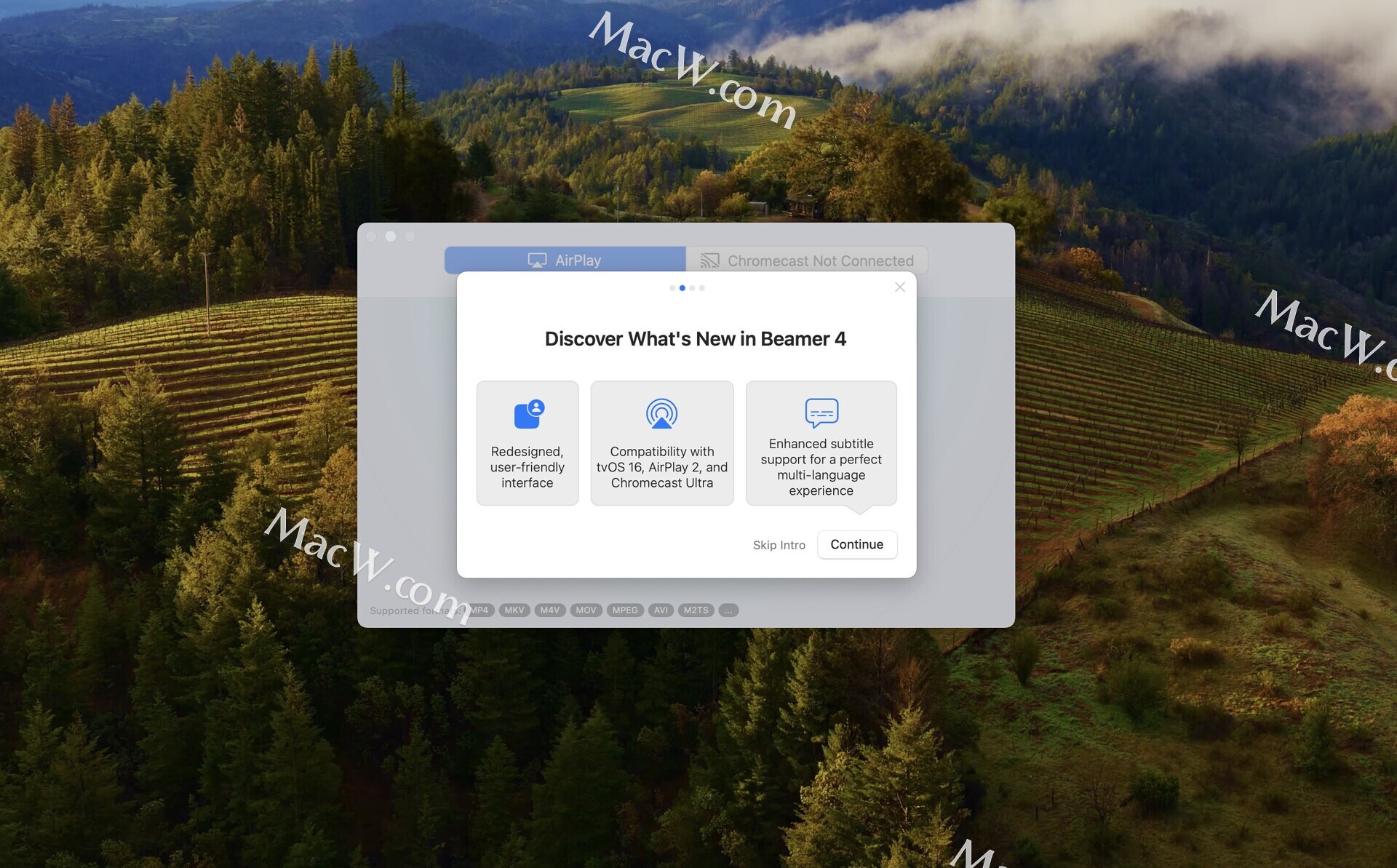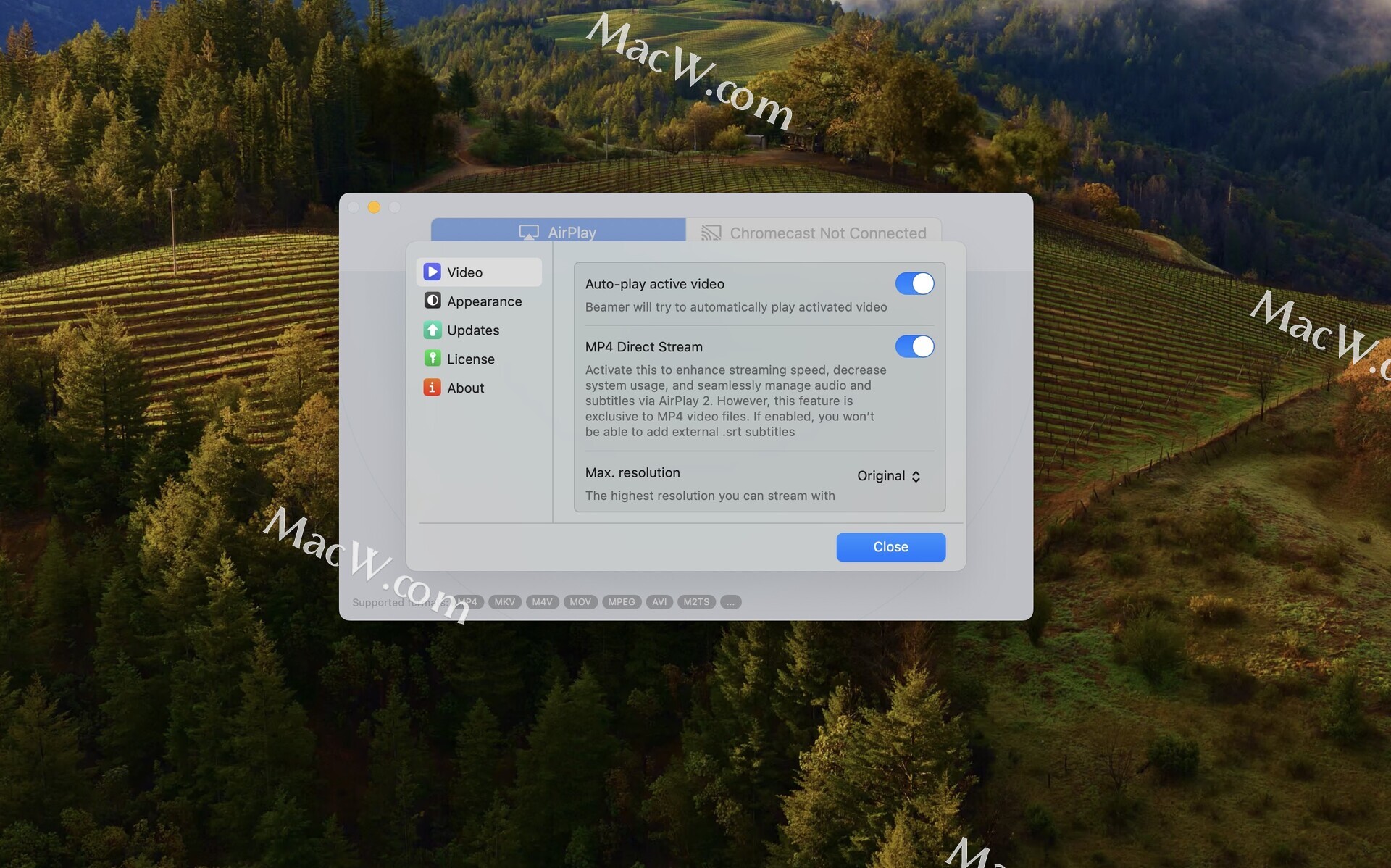 - 就像流行的桌面电影播放器,Beamer for Mac接受所有常见的格式,编解码器和决议。AVI,MKV,MOV,MP4,WMV,FLV,Beamer等等。