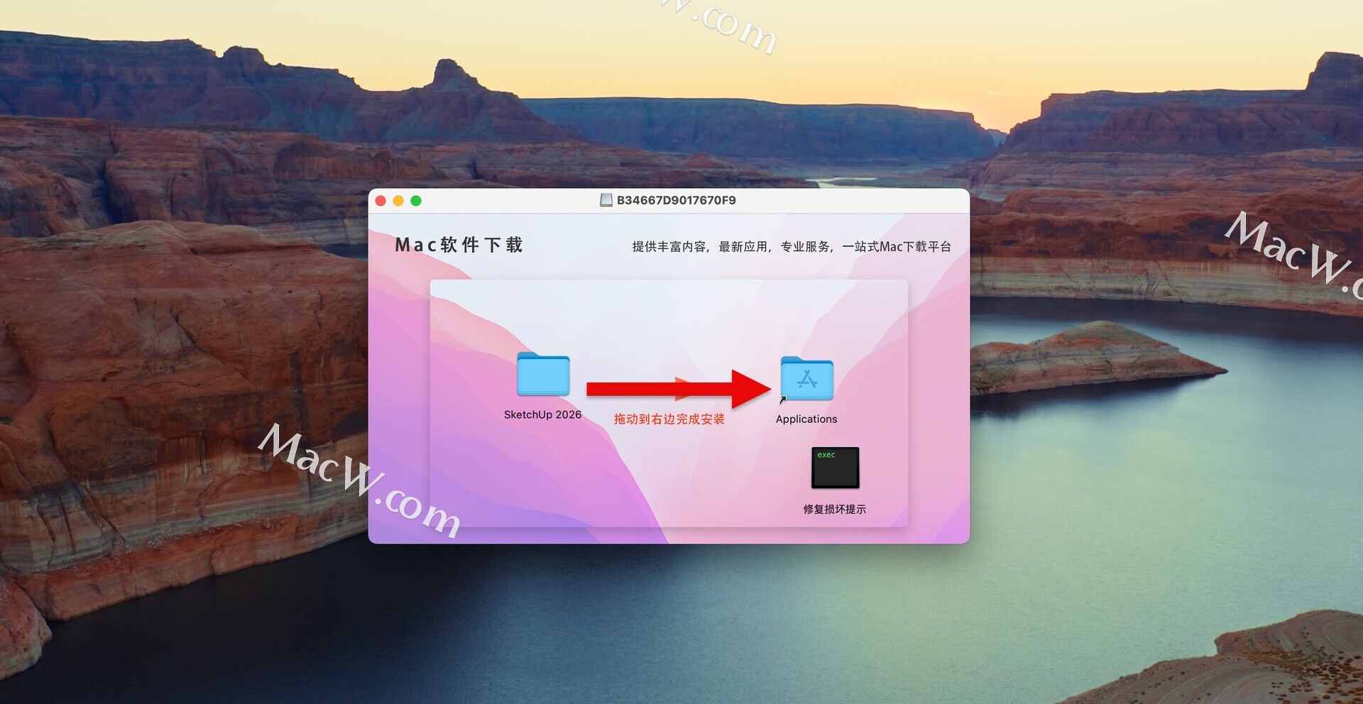 SketchUp Pro破解版下载完成后打开,拖动SketchUp 2026到右侧应用程序中即可
