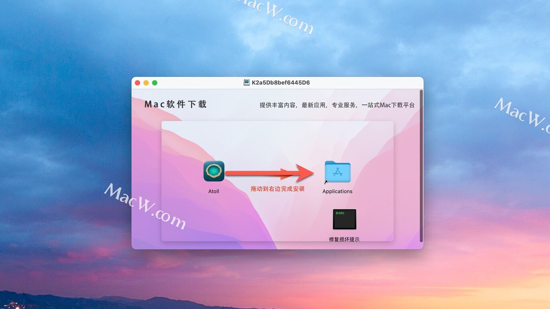 打开下载好的软件包,拖动Atoll到右边的文件夹中进行安装