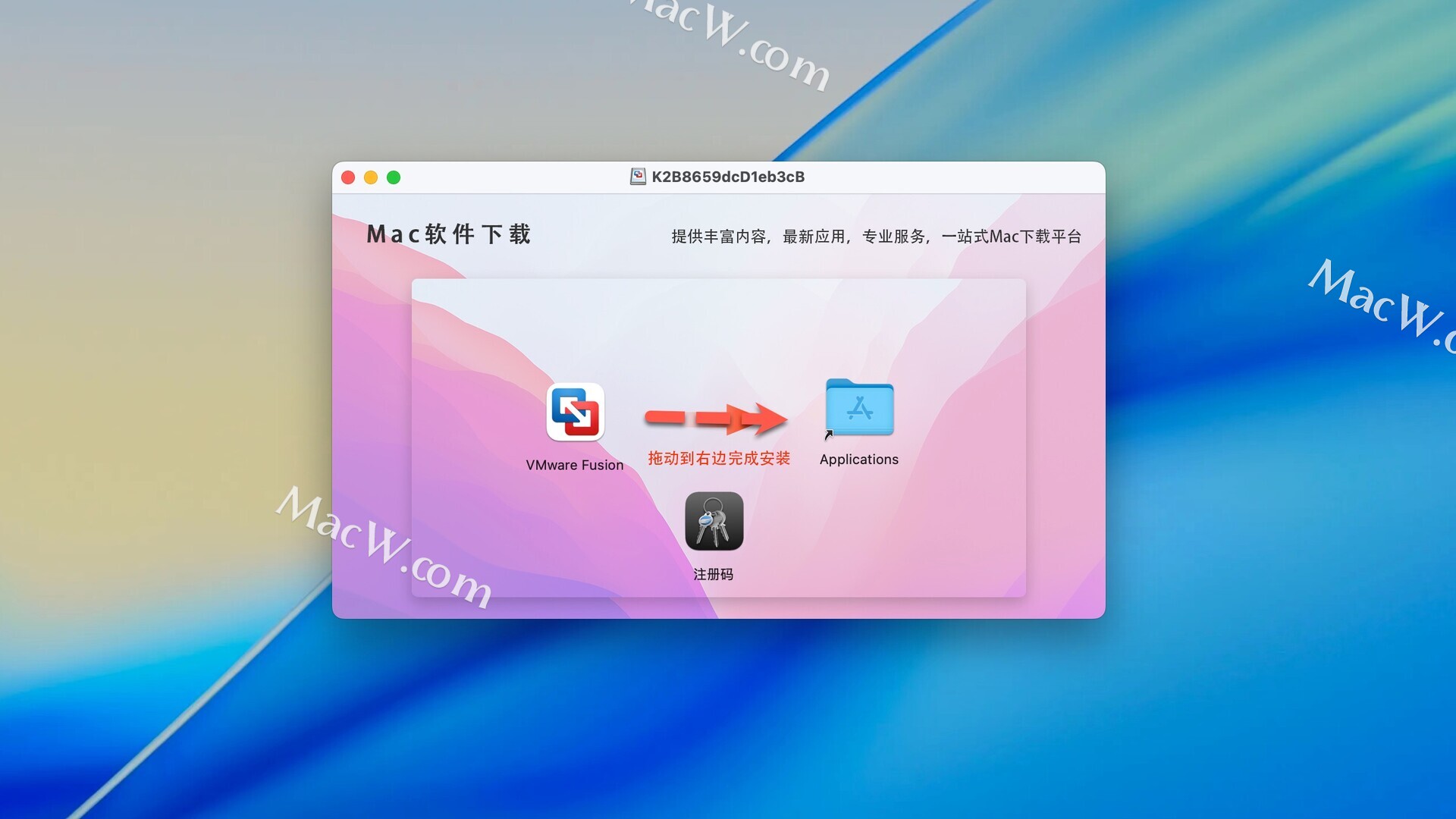 VMware Fusion Pro破解版下载完成后打开,拖动左侧的软件到右侧应用程序中即可