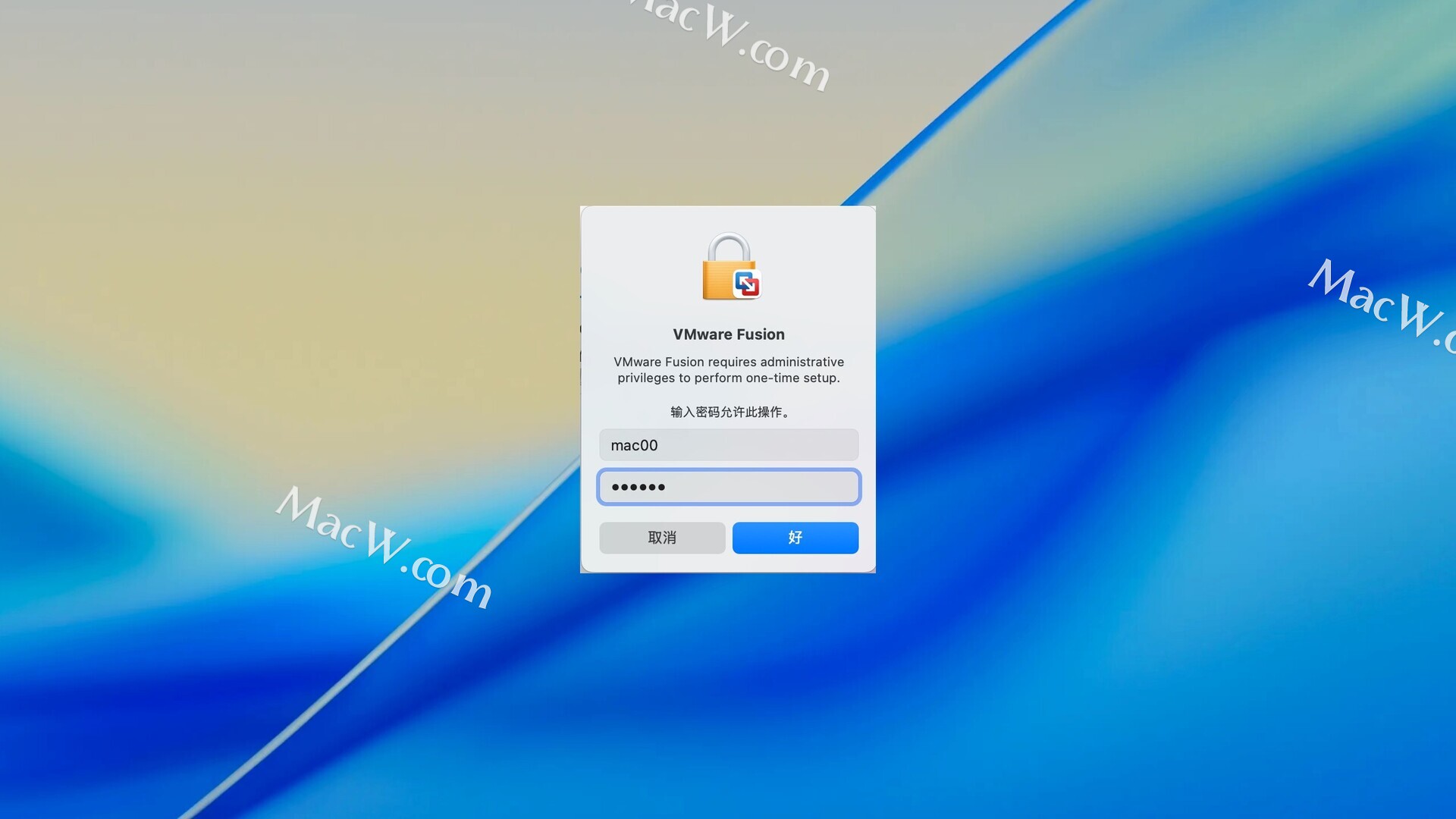 应用程序中打开VMware Fusion,弹出需要权限窗口,输入电脑密码,点击好