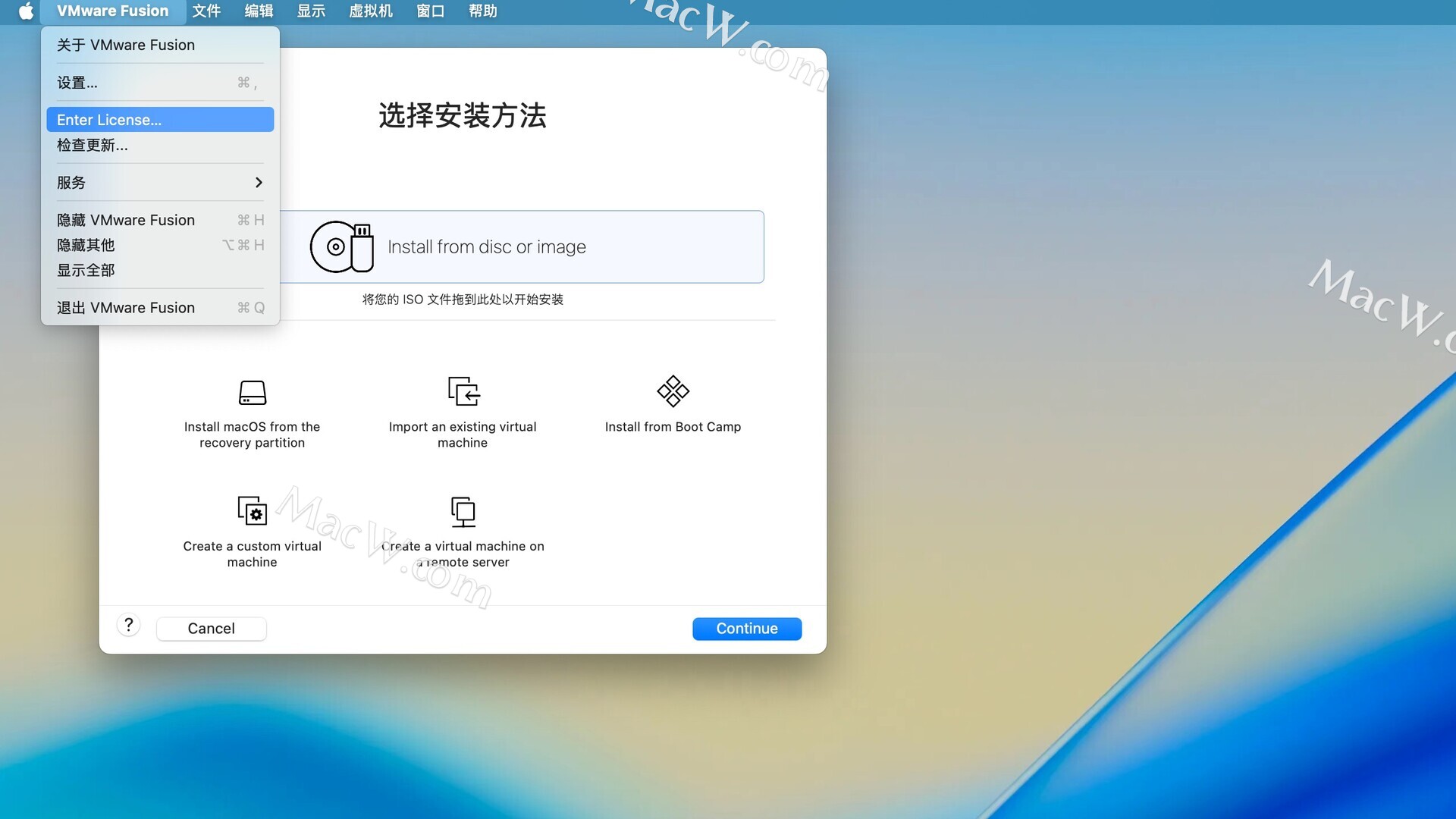 然后左上角菜单栏点击VMware Fusion---Enter license