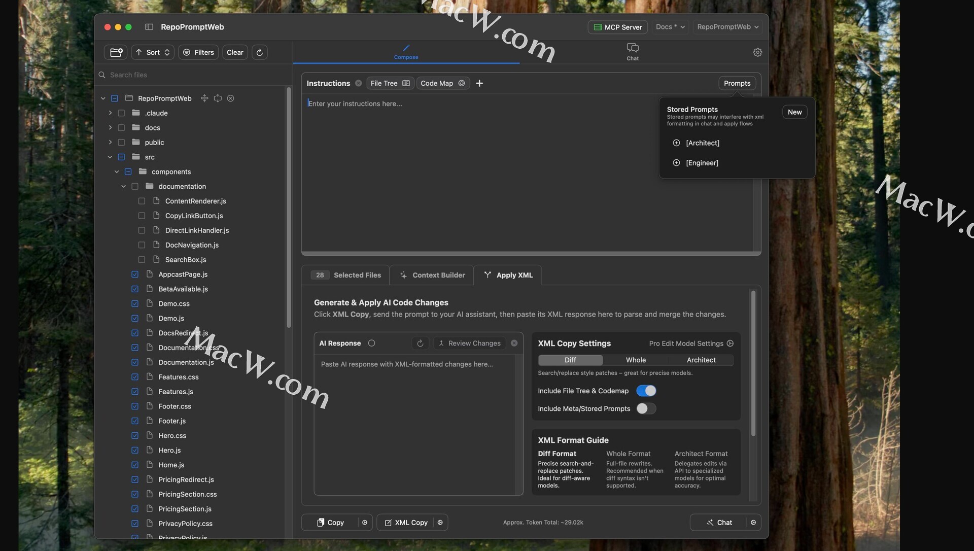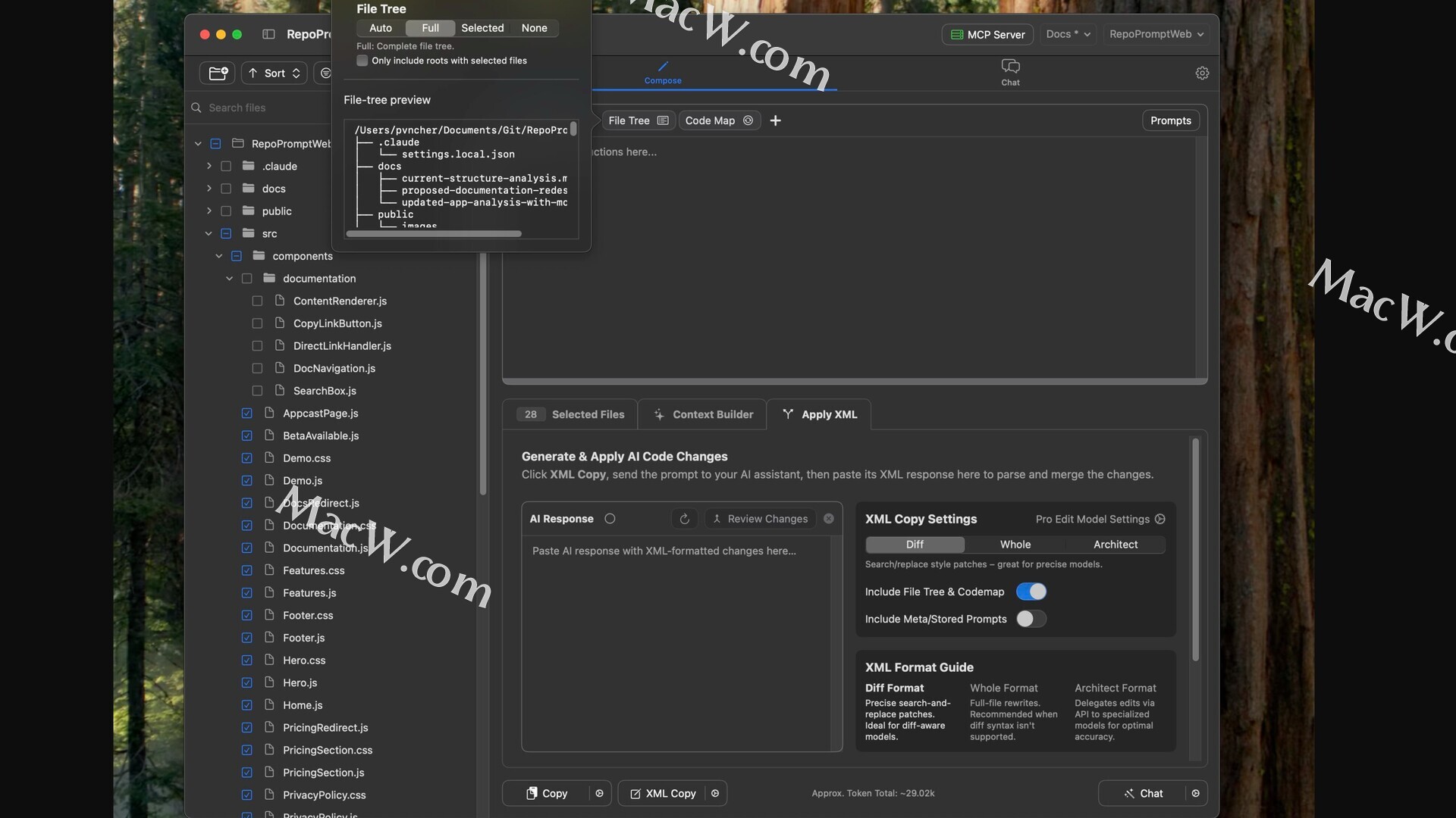 Repo Prompt for mac是一款旨在简化代码开发过程中使用 AI 模型操作的应用程序。它帮助开发者高效地管理和修改使用 AI 的代码文件,提供精准的上下文控制并与各种模型集成。