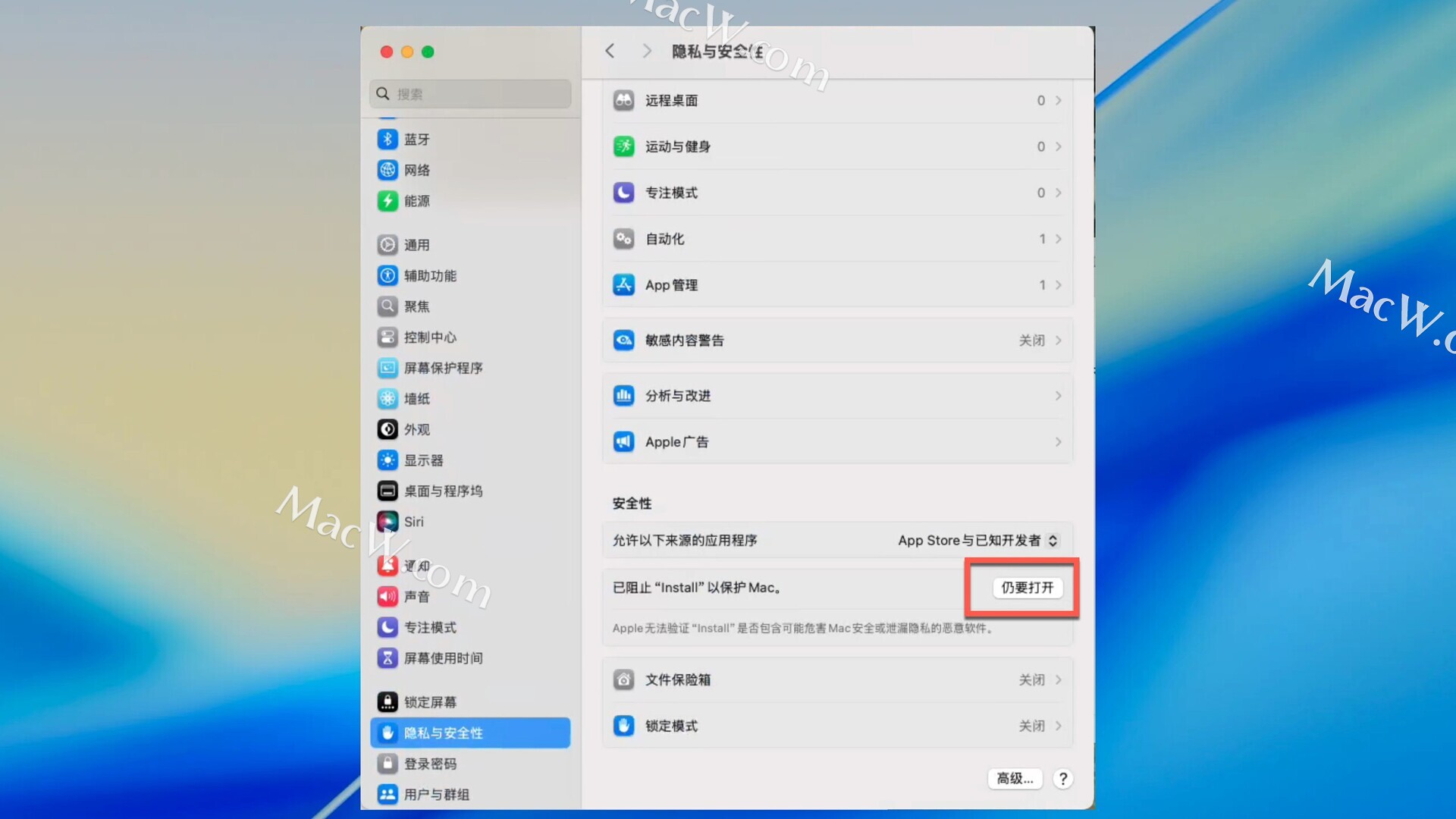 并在系统设置隐私与安全性里面点击仍要打开,才能安装